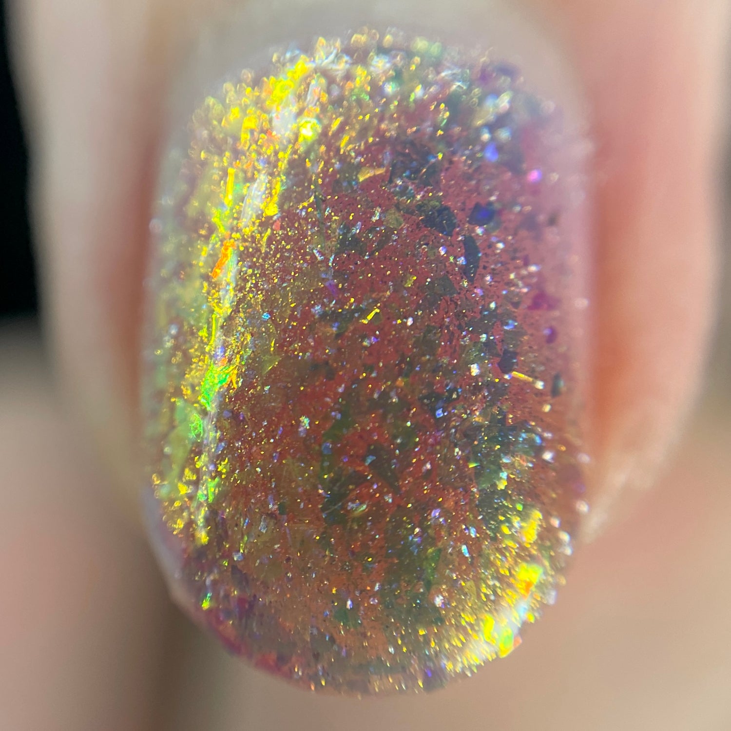 A pastel pink polish filled with shifting irridescent flakes and some small holographic flakes.