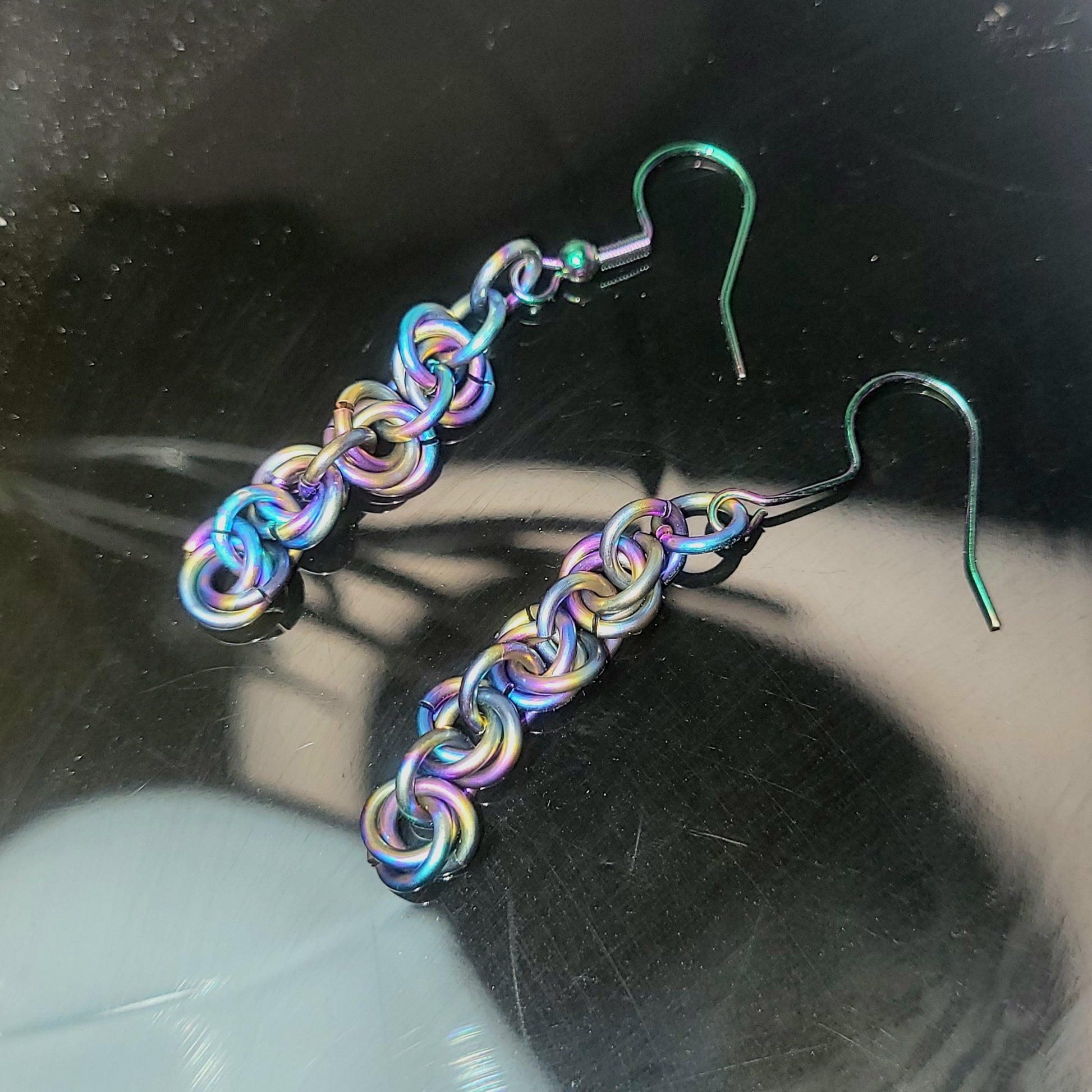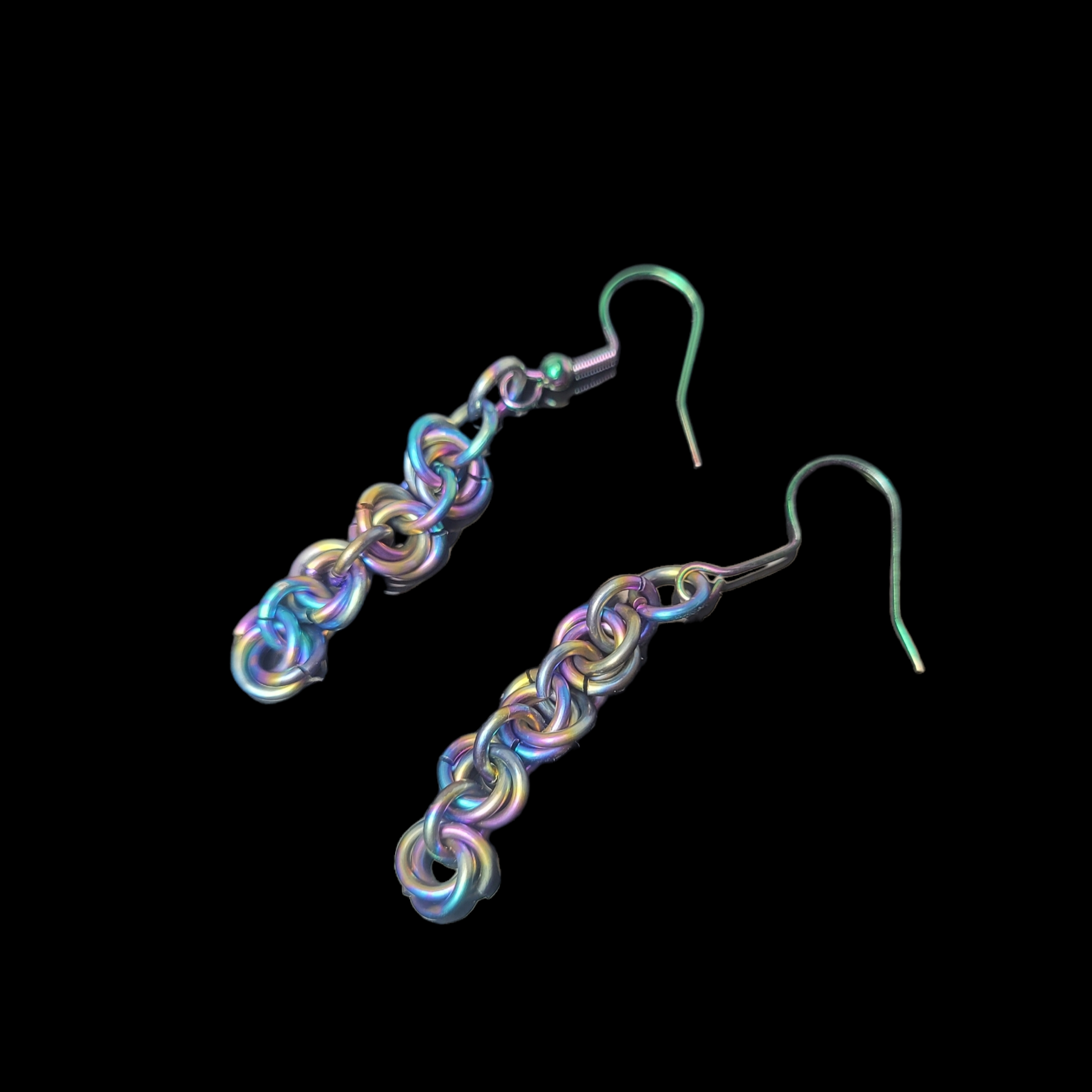 This set is made of rainbow anodized titanium and 201 stainless steel hooks. This pair of earring will show off a variety of colours. They are approximatly 2" in length.