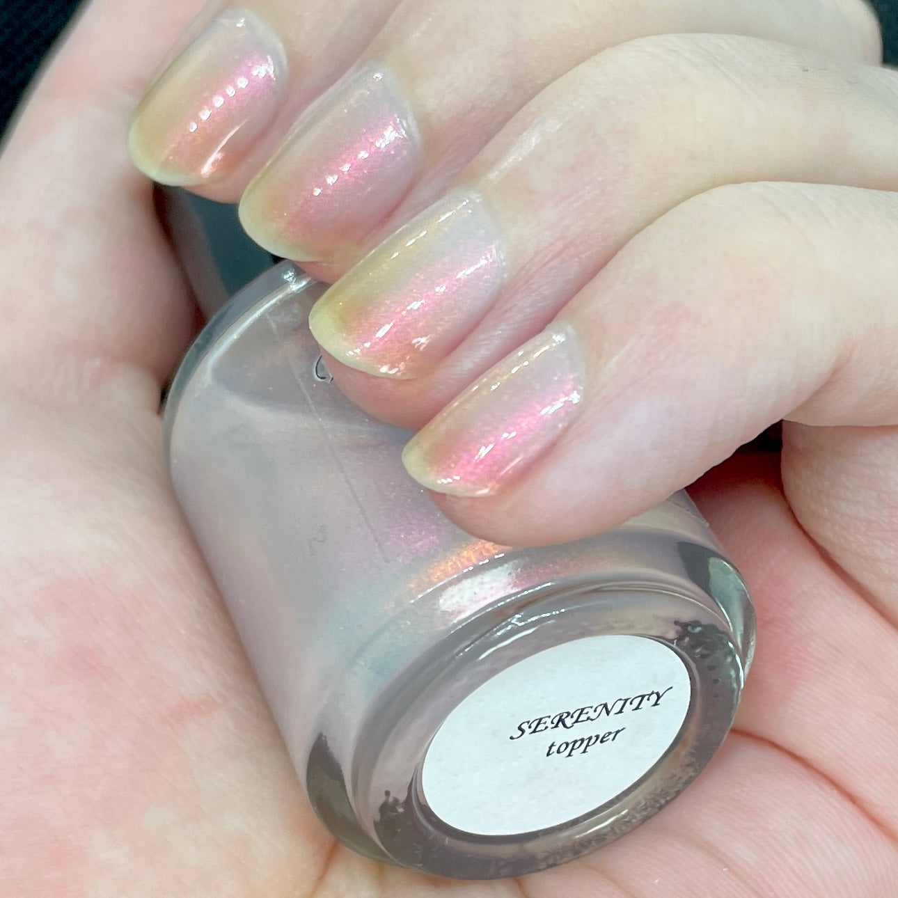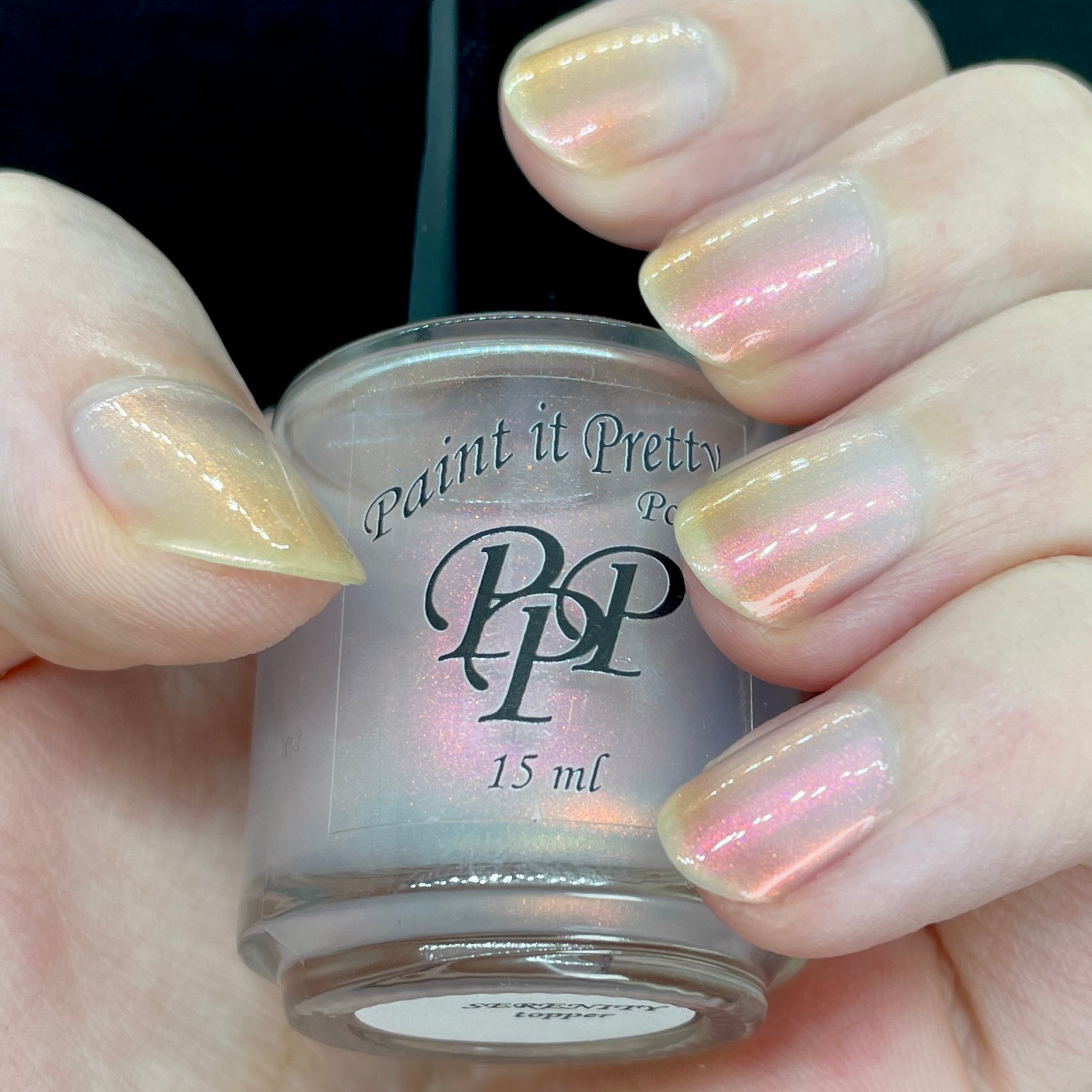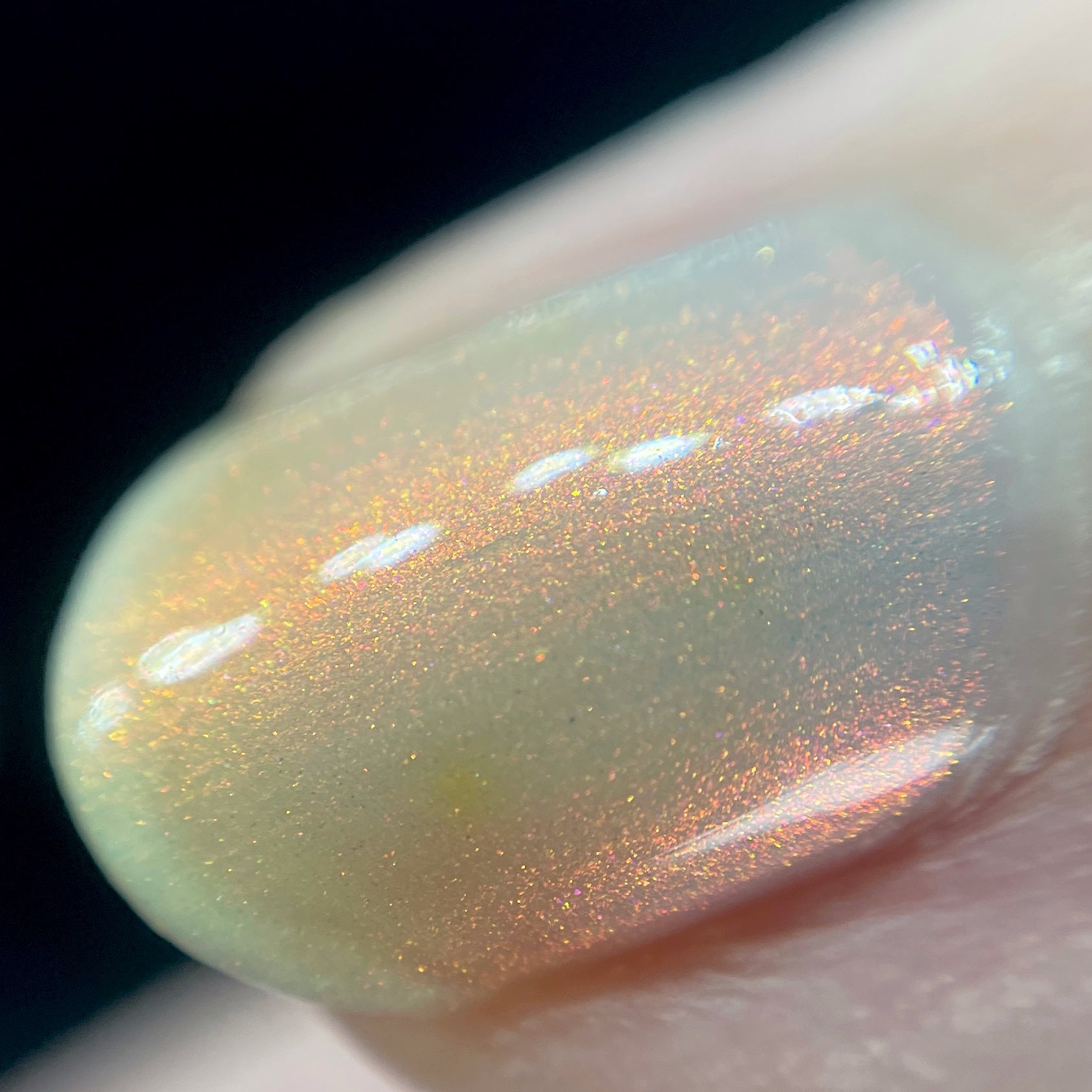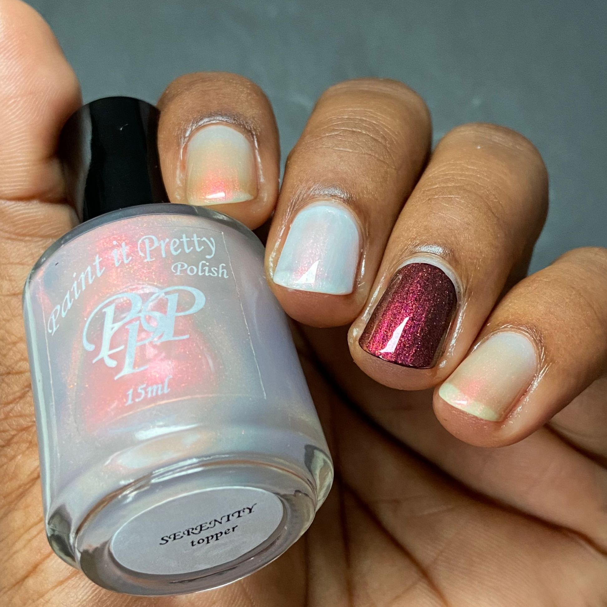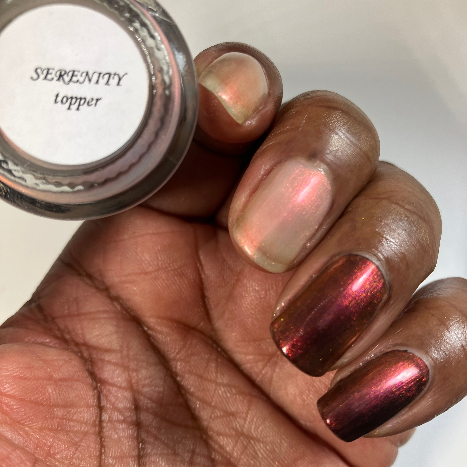 Serenity is beautiful red/orange shifting topper. Wear it on it's own for a soft milky shimmer effect or over darker shades to make the shifts pop.