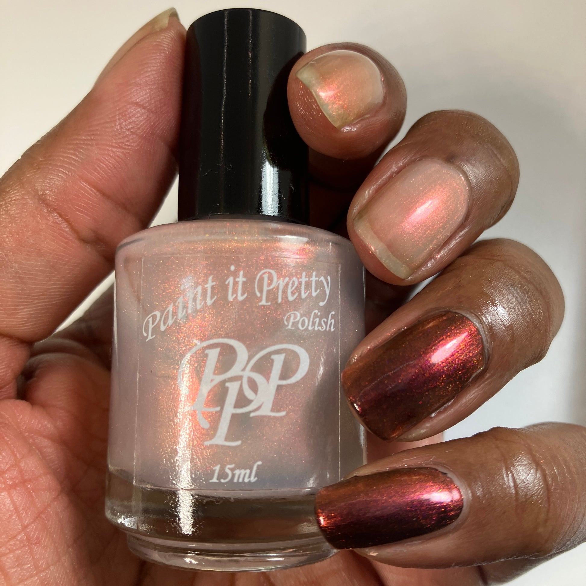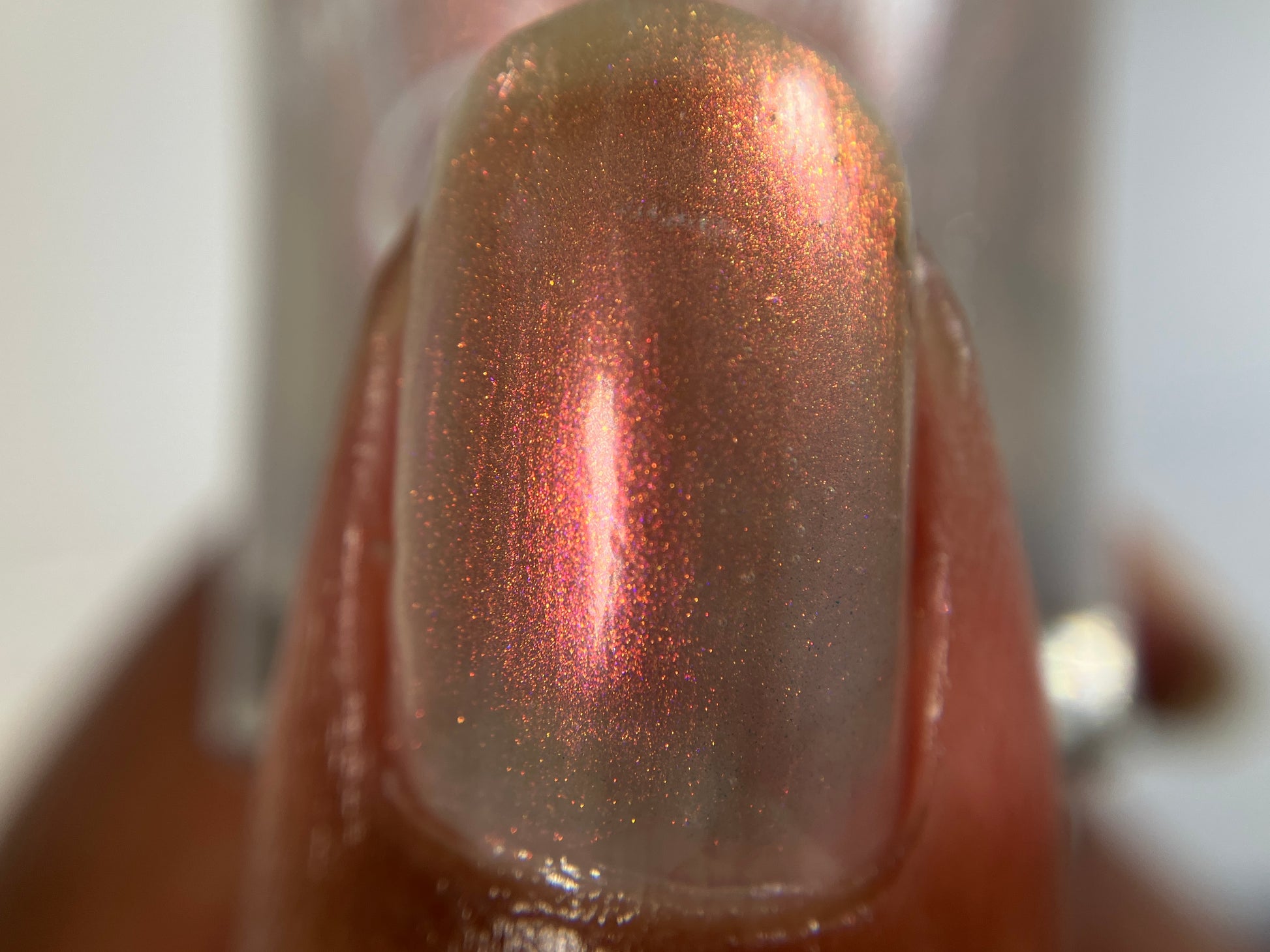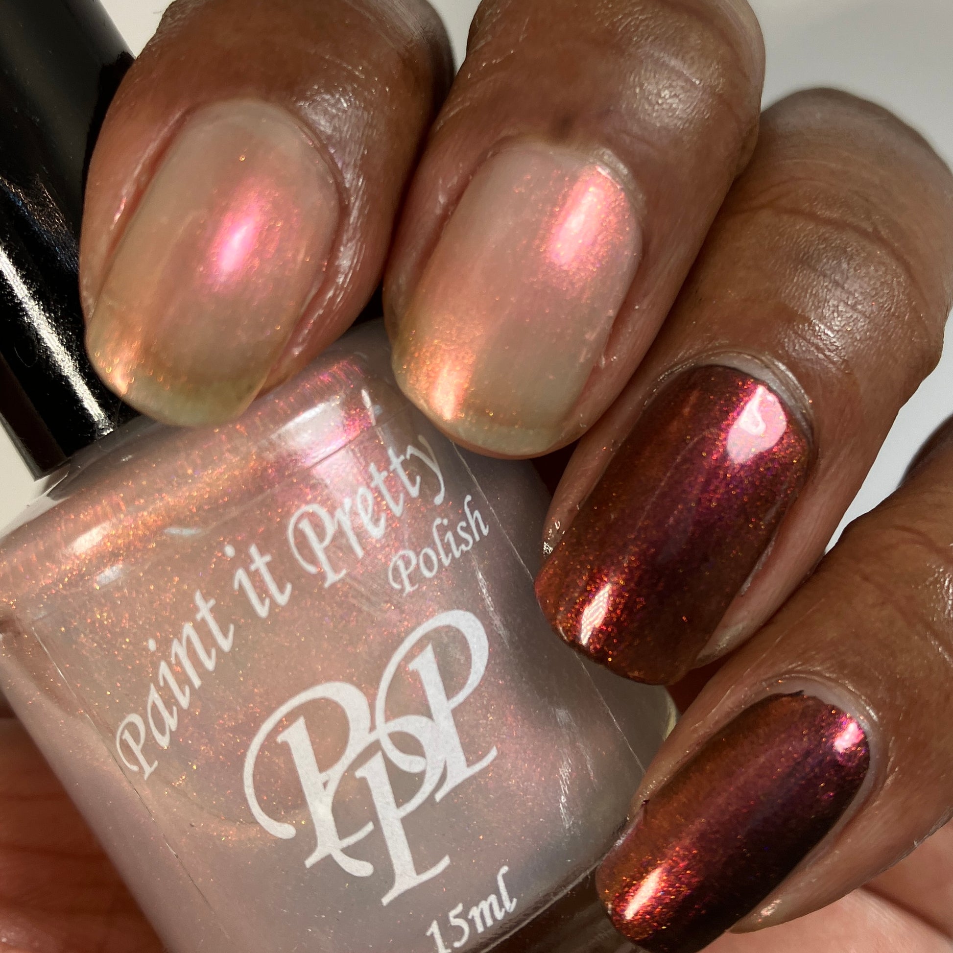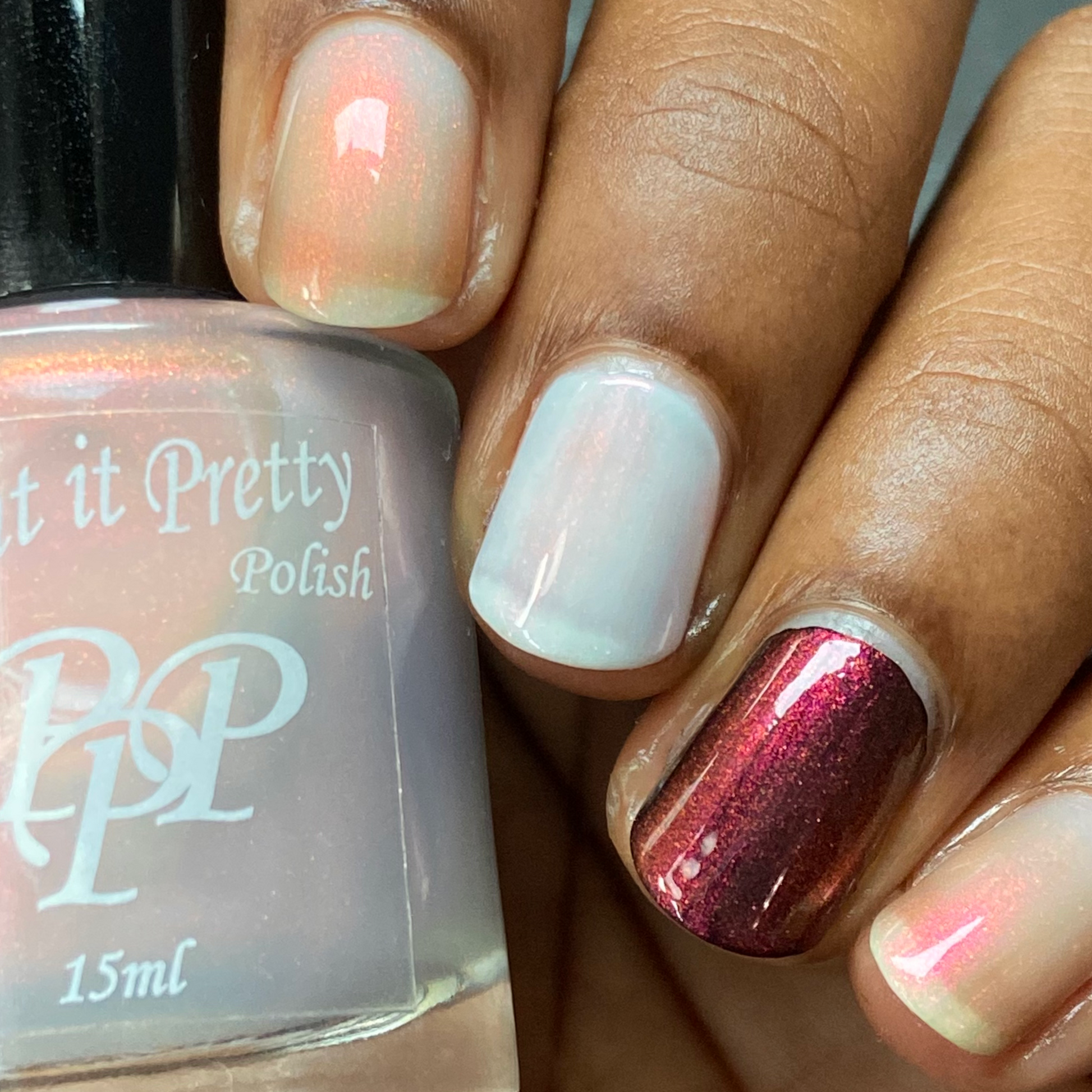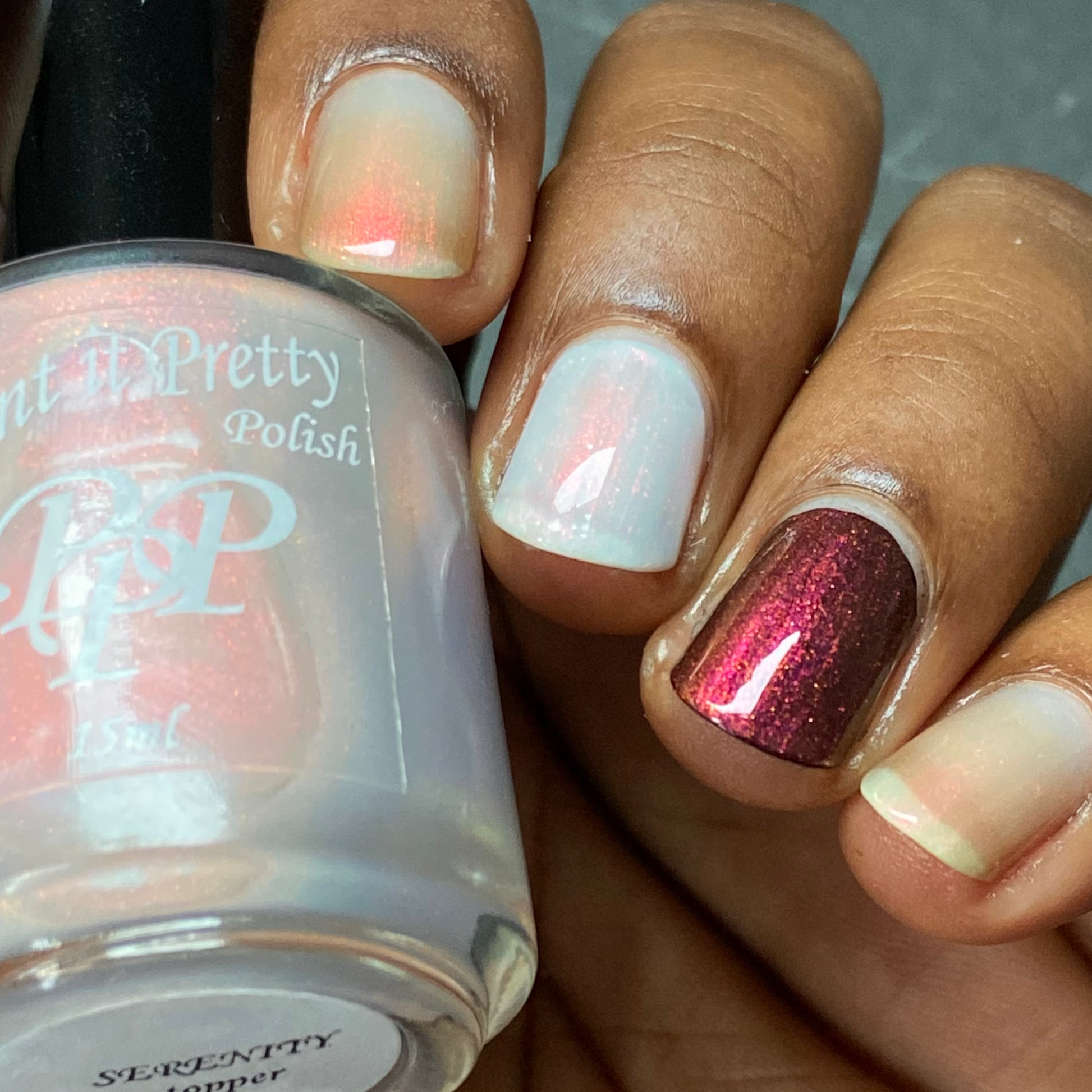 Serenity is beautiful red/orange shifting topper. Wear it on it's own for a soft milky shimmer effect or over darker shades to make the shifts pop.