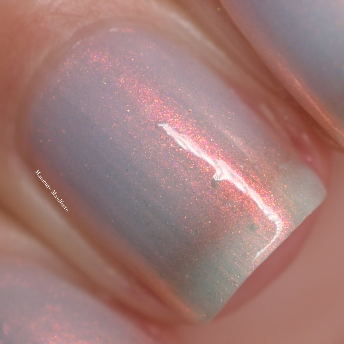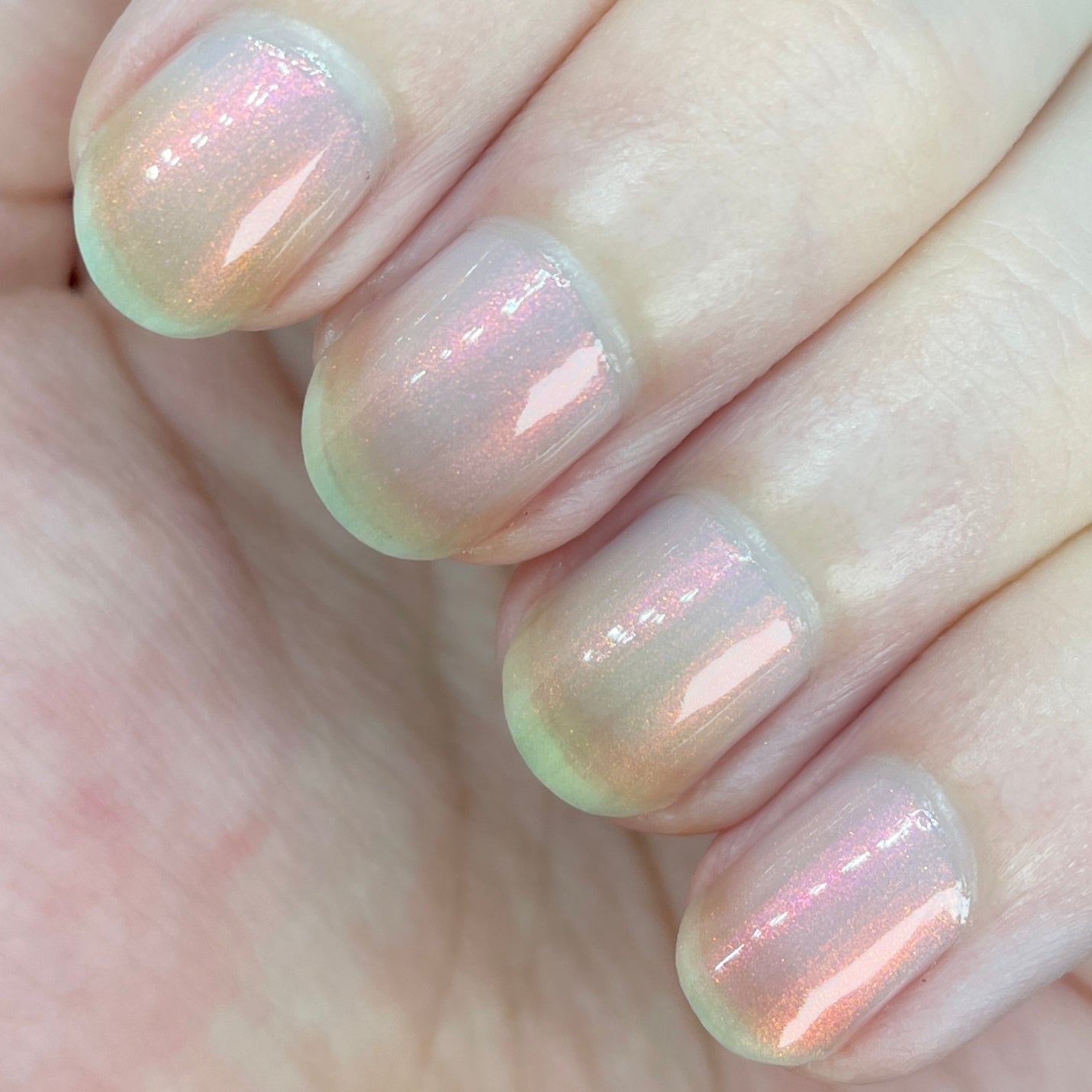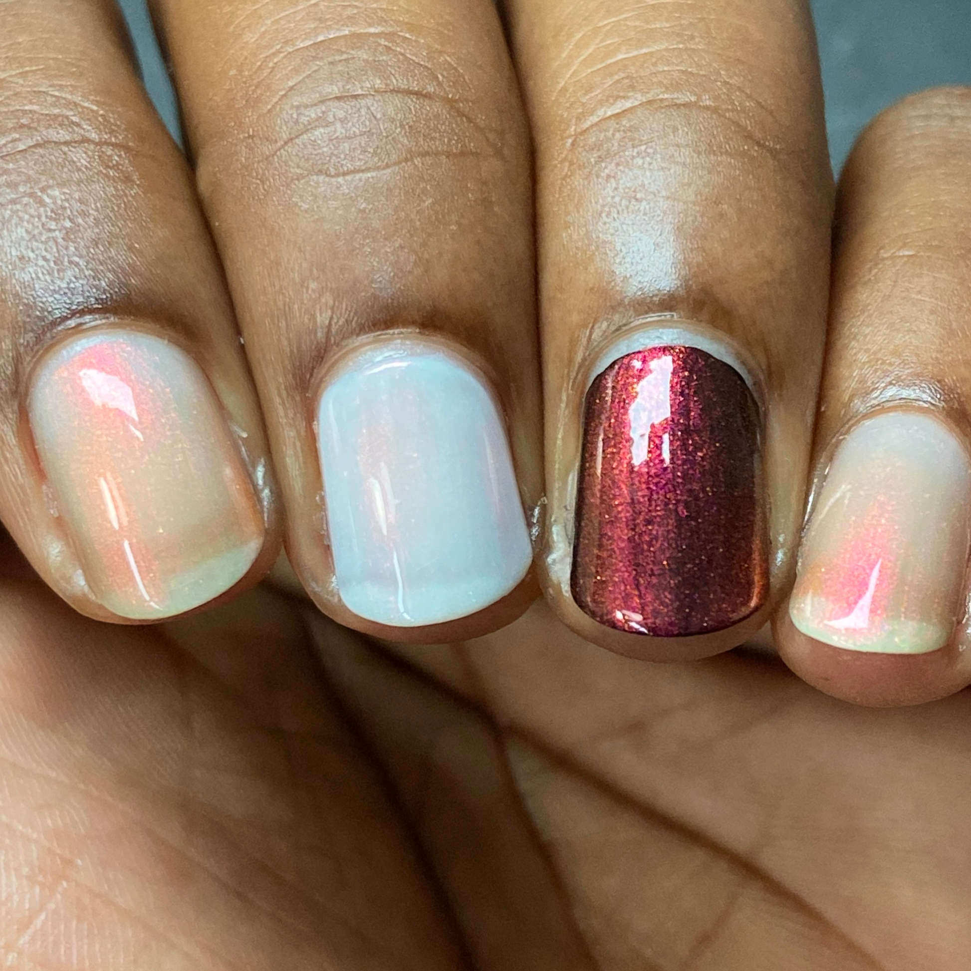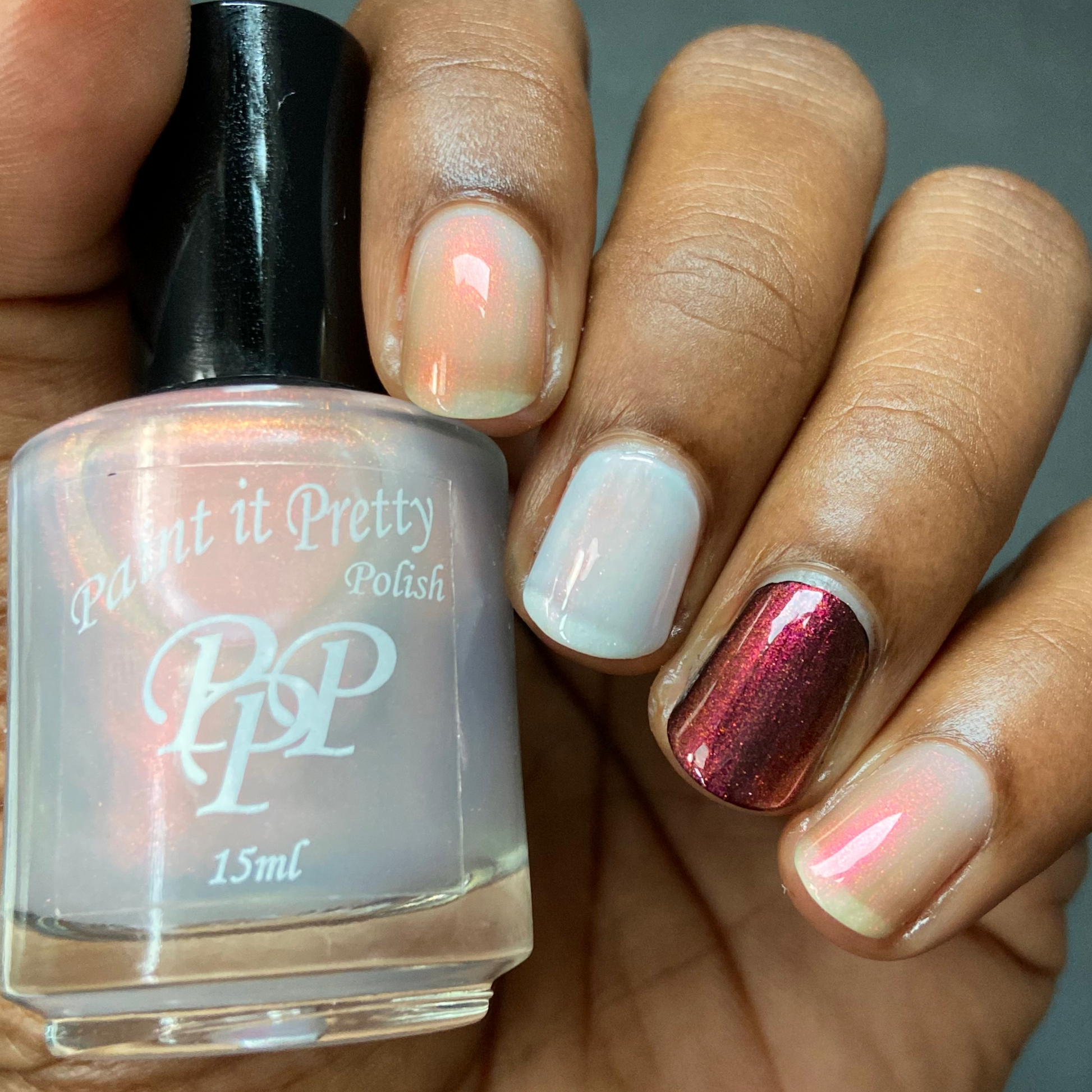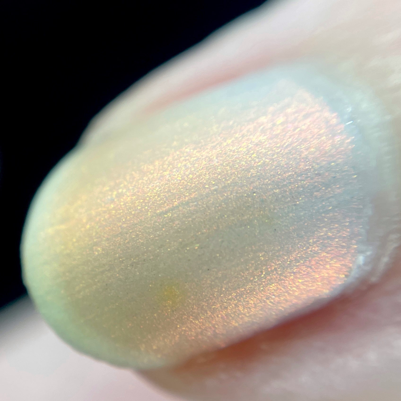 Serenity is beautiful red/orange shifting topper. Wear it on it's own for a soft milky shimmer effect or over darker shades to make the shifts pop.