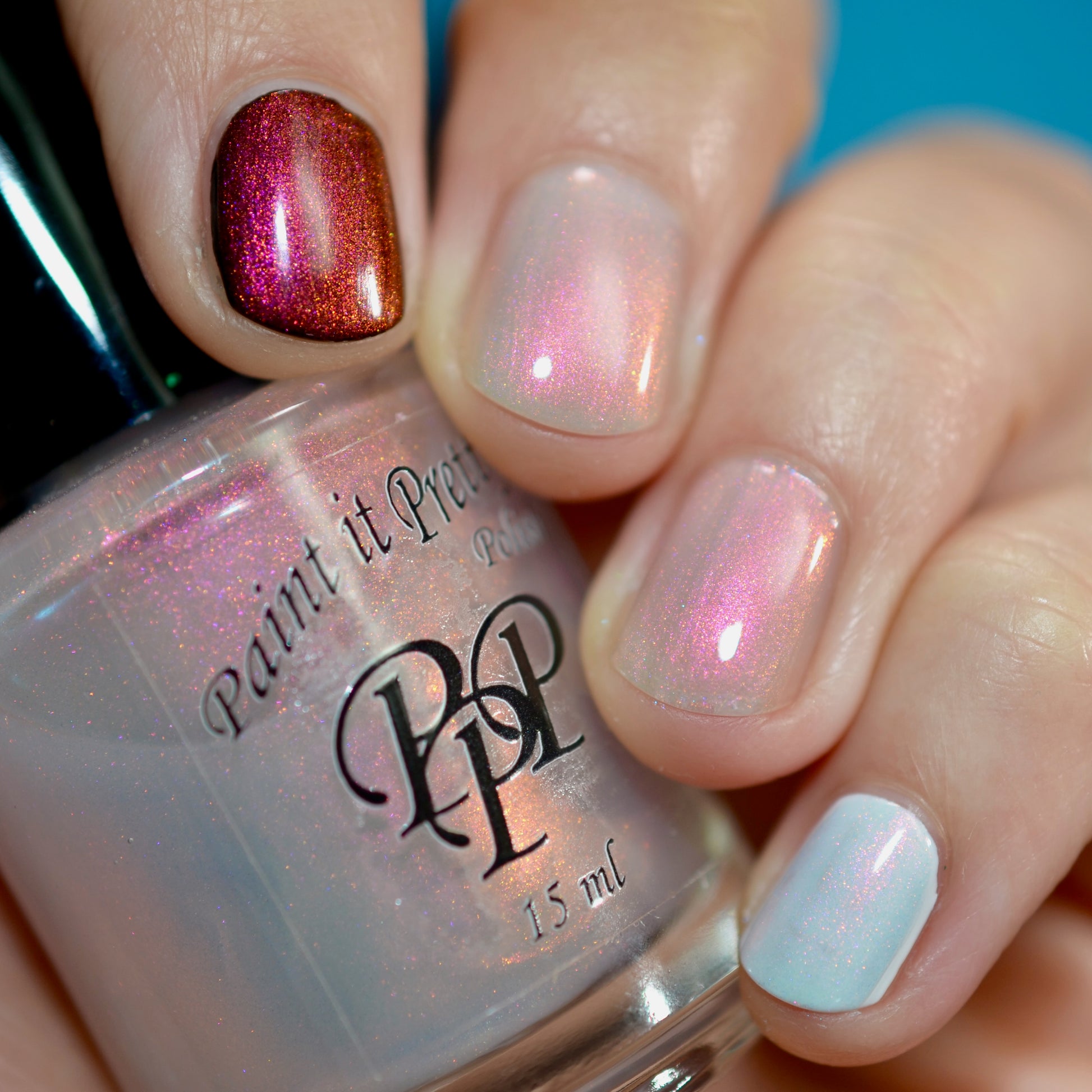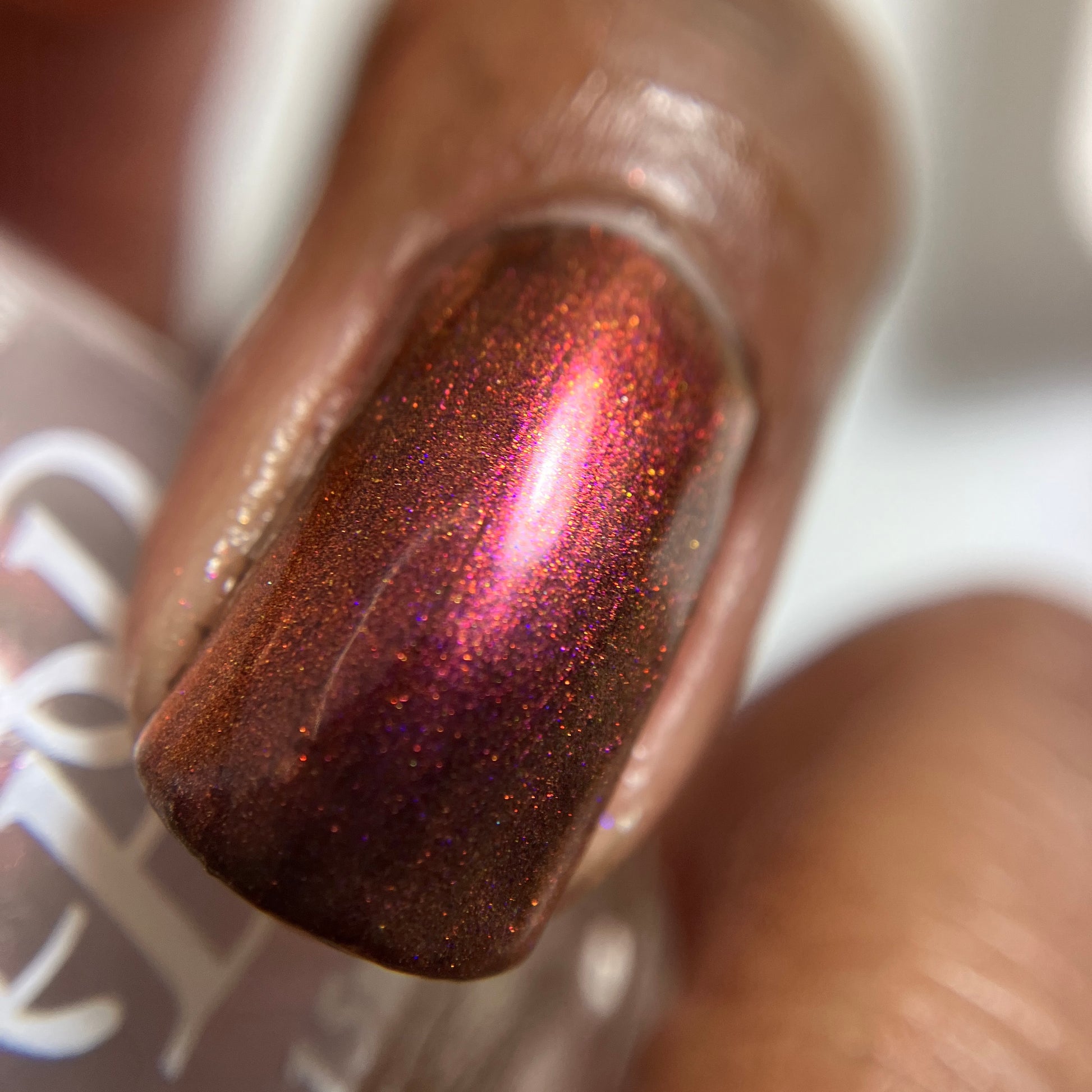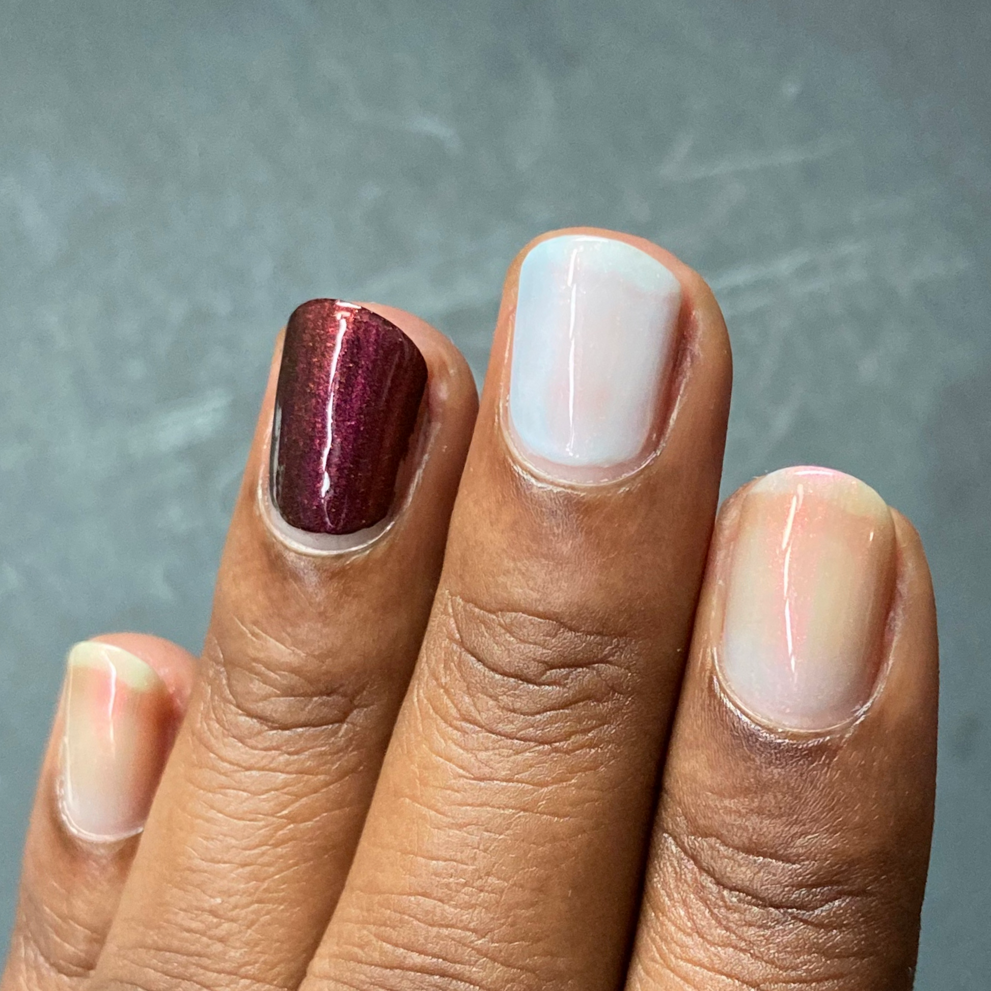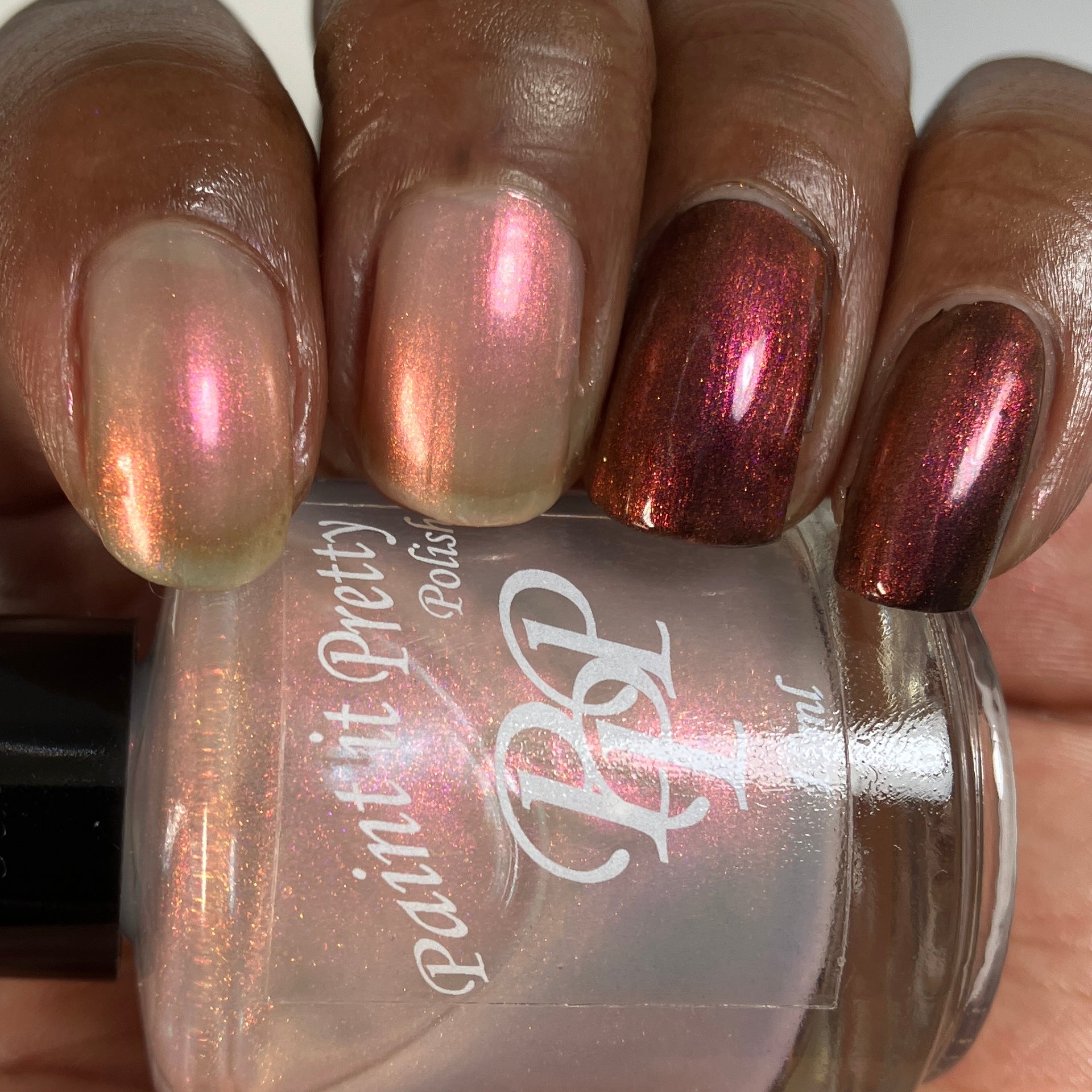 Serenity is beautiful red/orange shifting topper. Wear it on it's own for a soft milky shimmer effect or over darker shades to make the shifts pop.