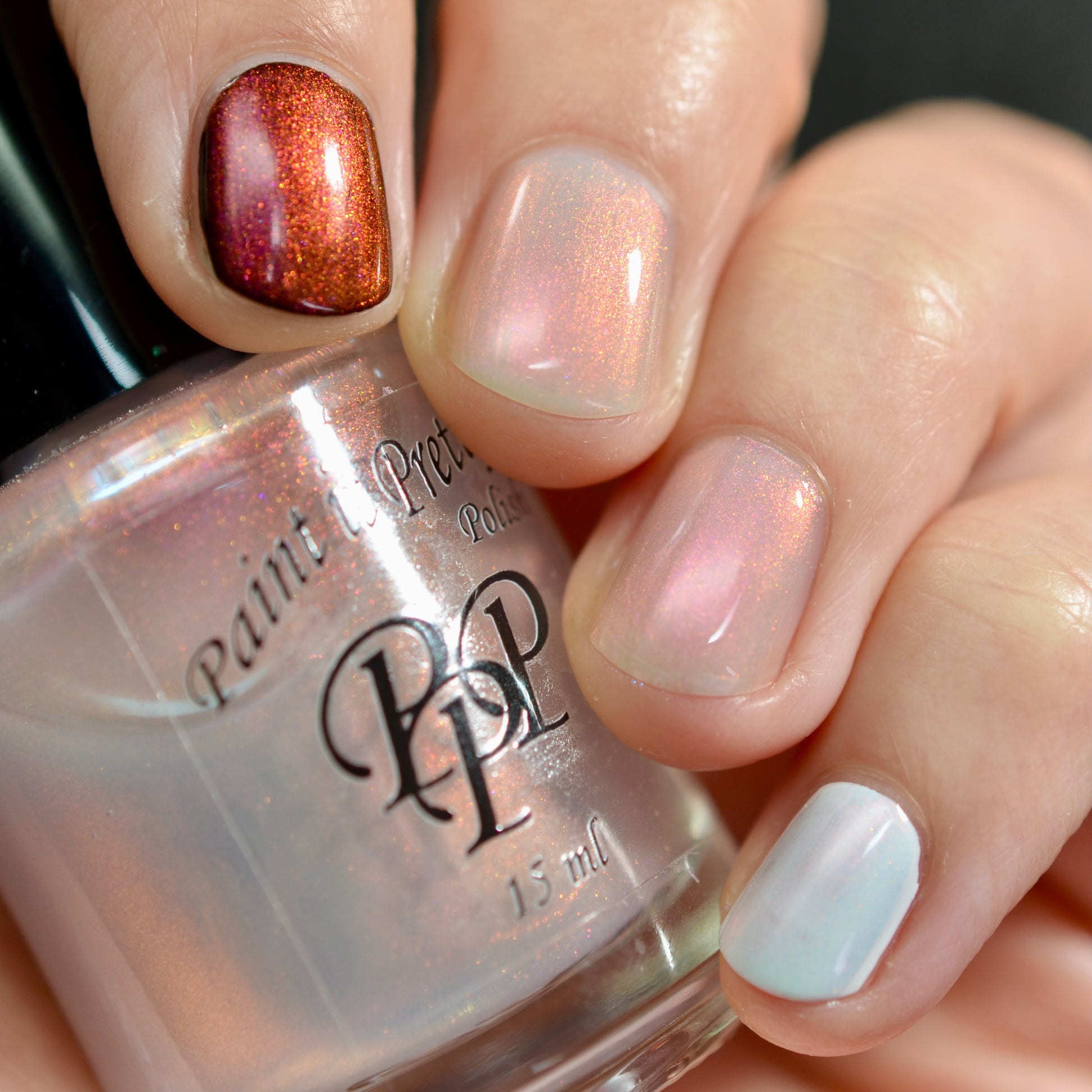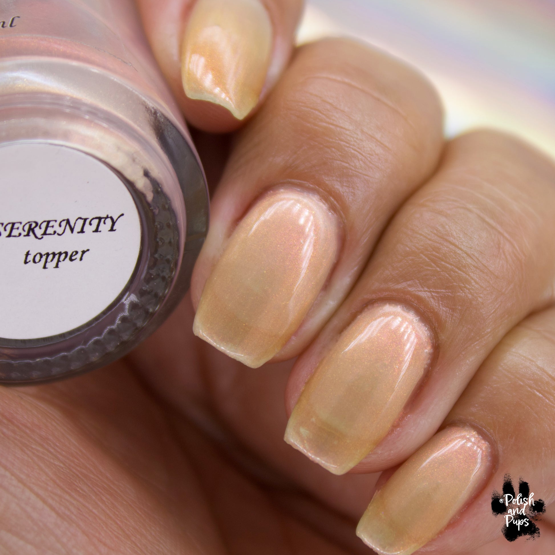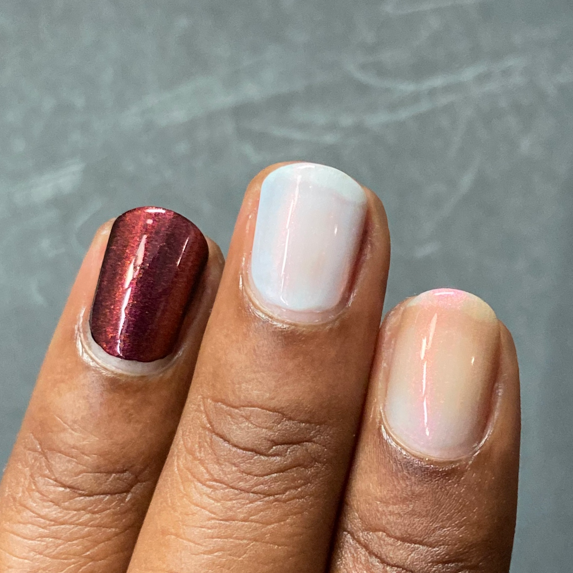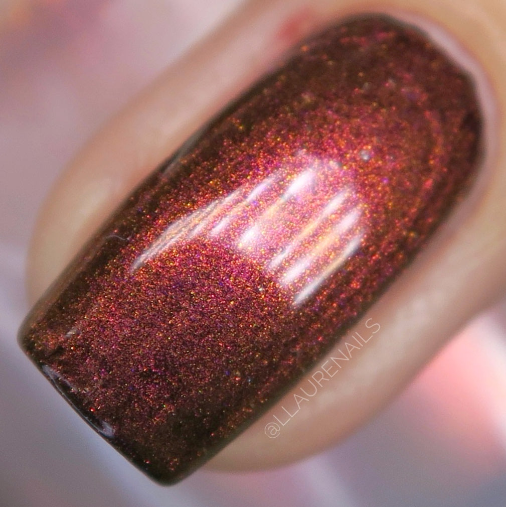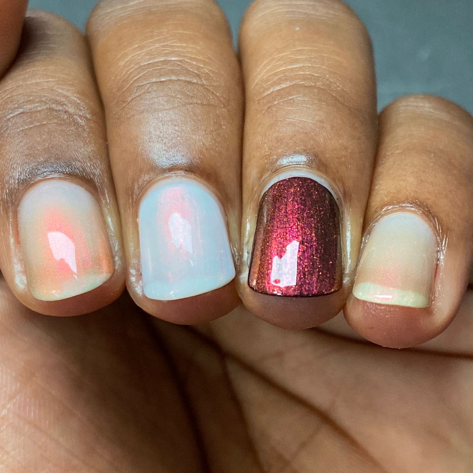 Serenity is beautiful red/orange shifting topper. Wear it on it's own for a soft milky shimmer effect or over darker shades to make the shifts pop.