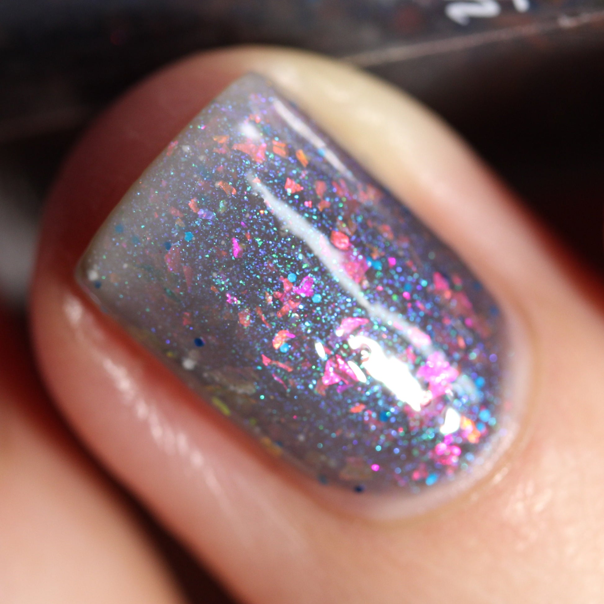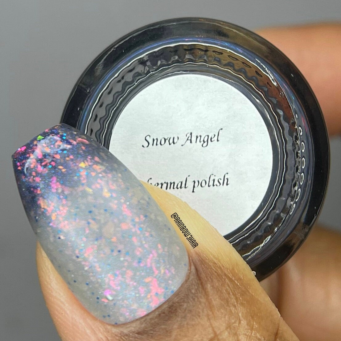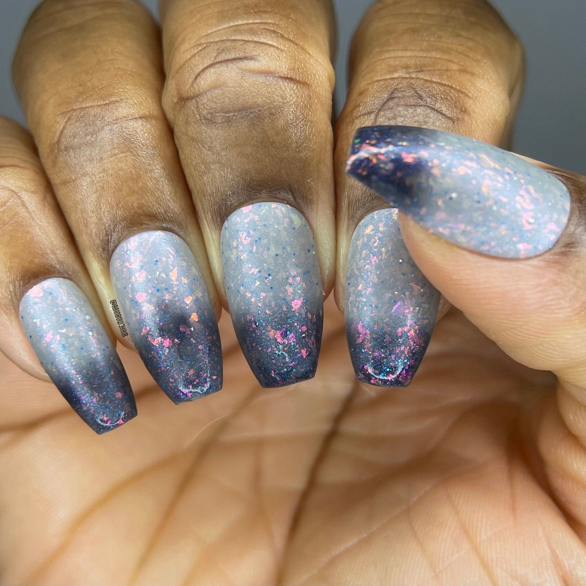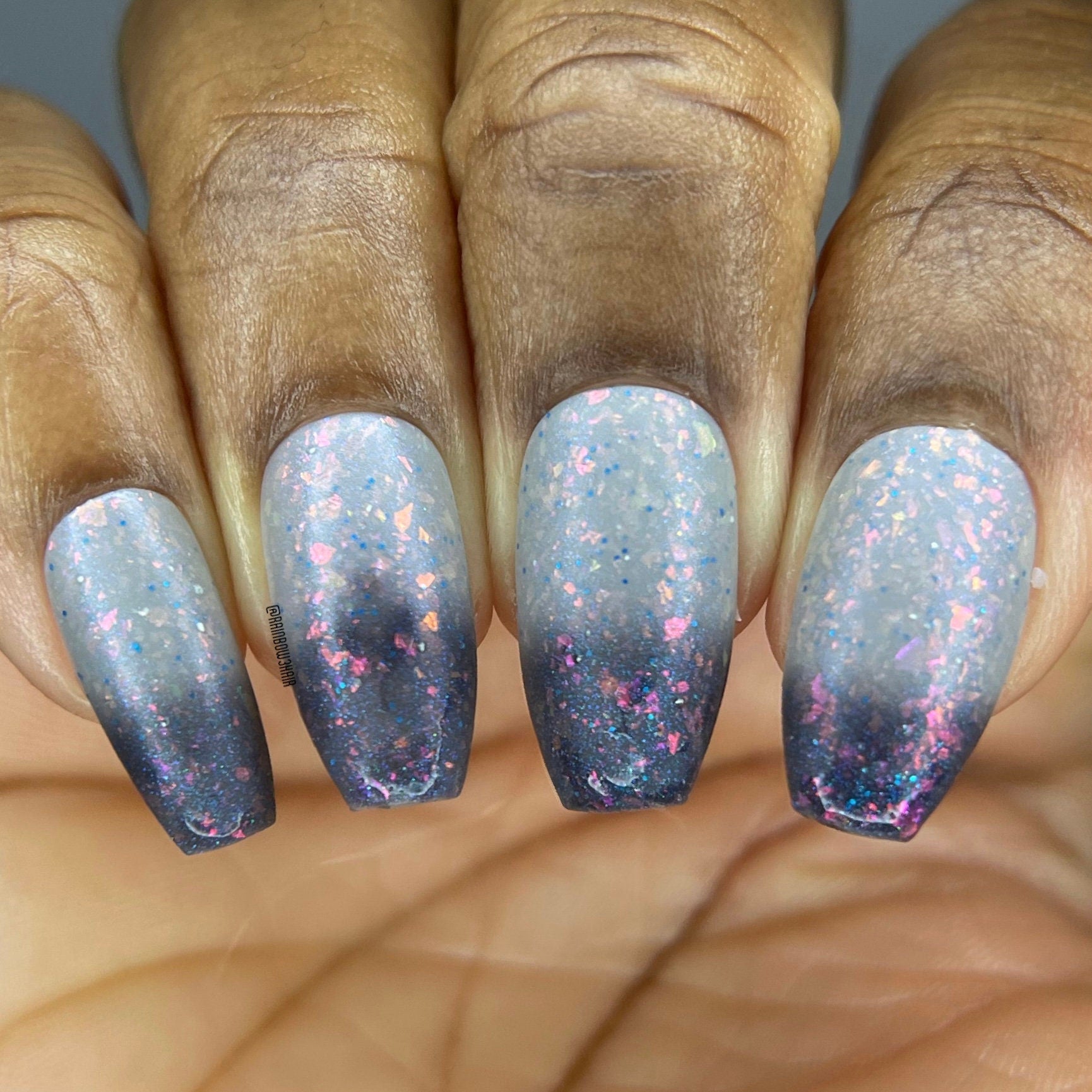 Snow Angel is a grey lovers dream thermal nail polish. Shifting between a light, almost white when warm to a darker grey almost black when cold with orange, pink, purple, green flakes, a blue shimmer and blue micro glitters.