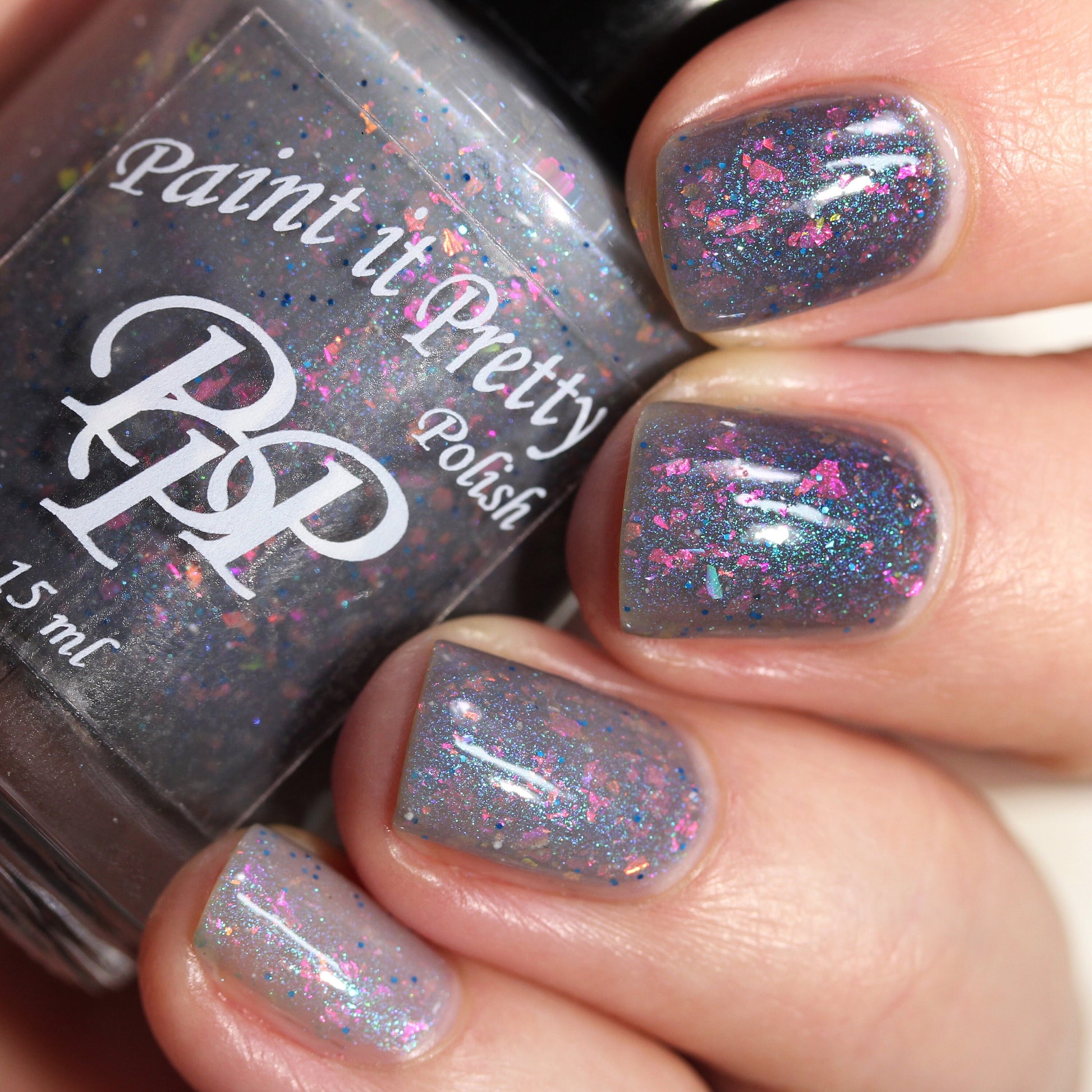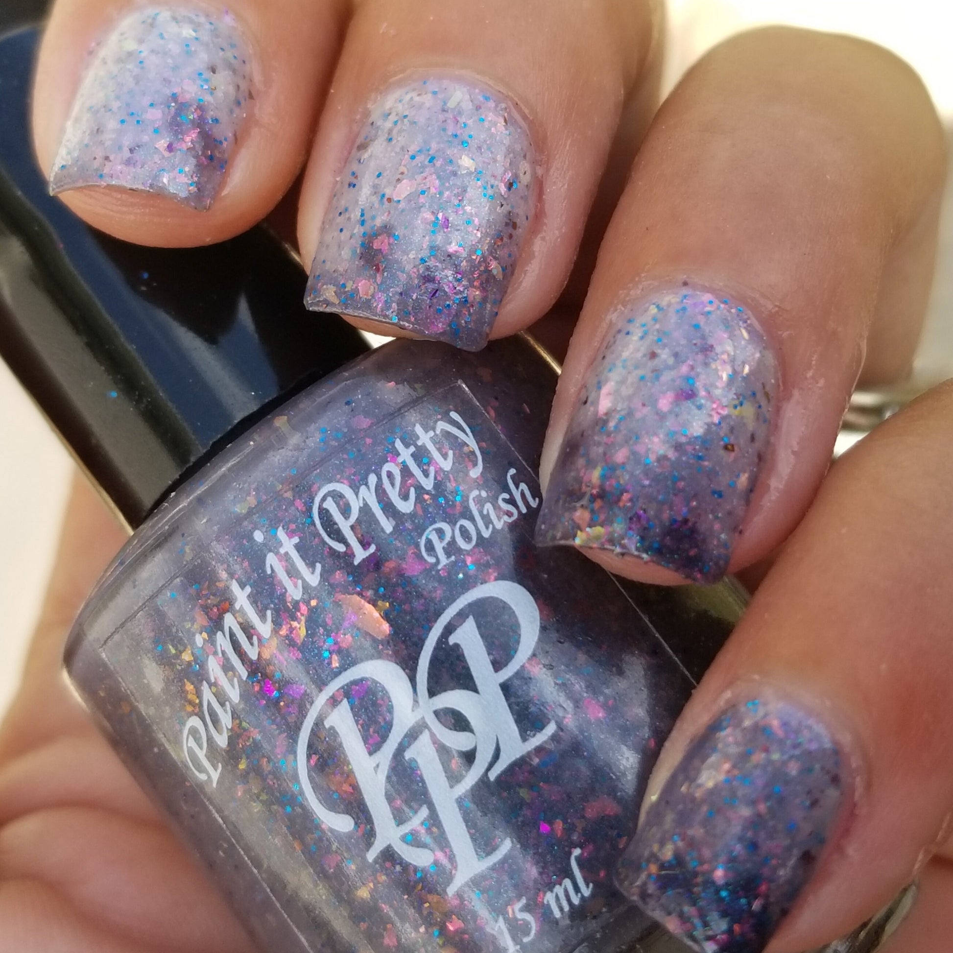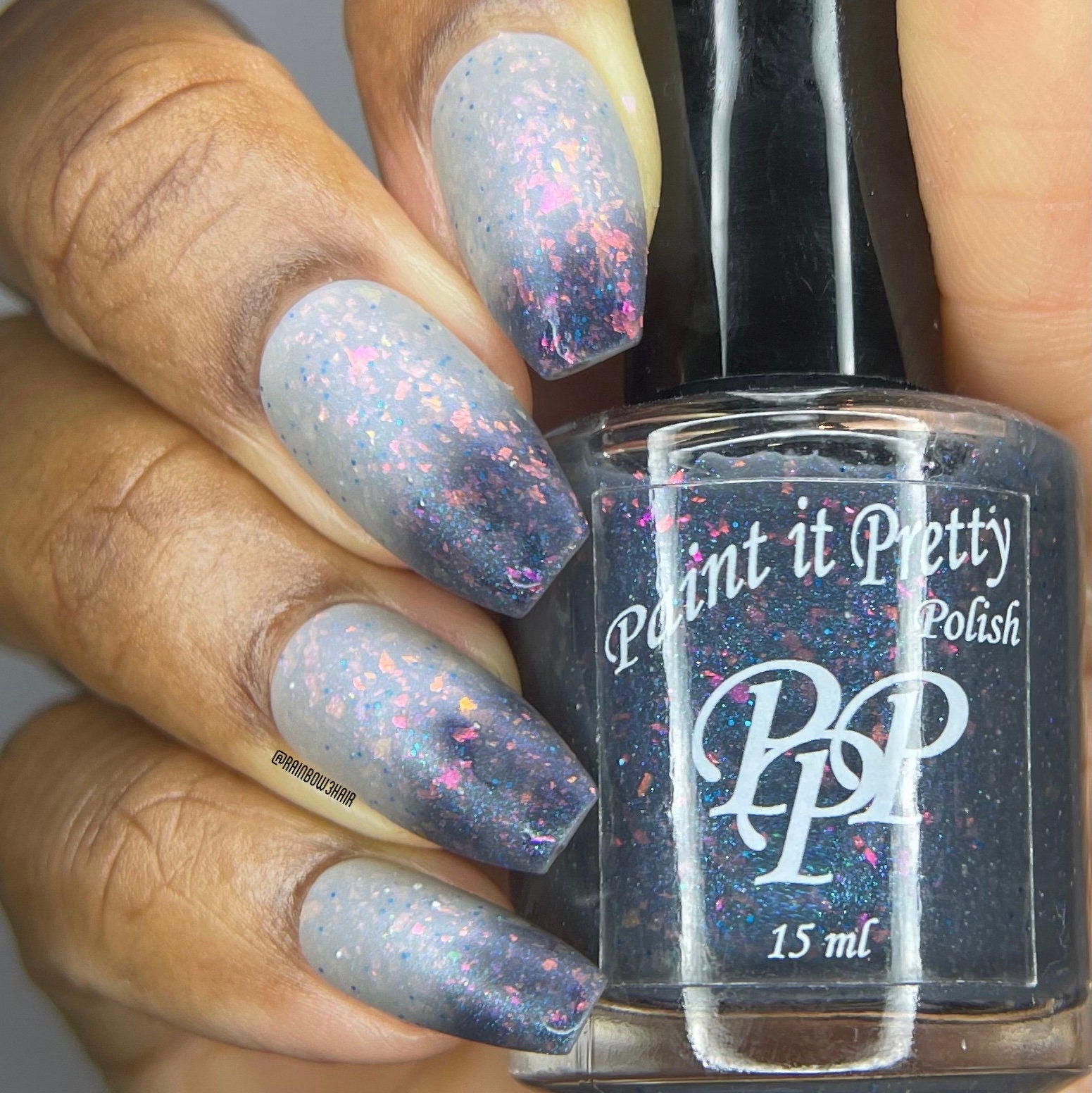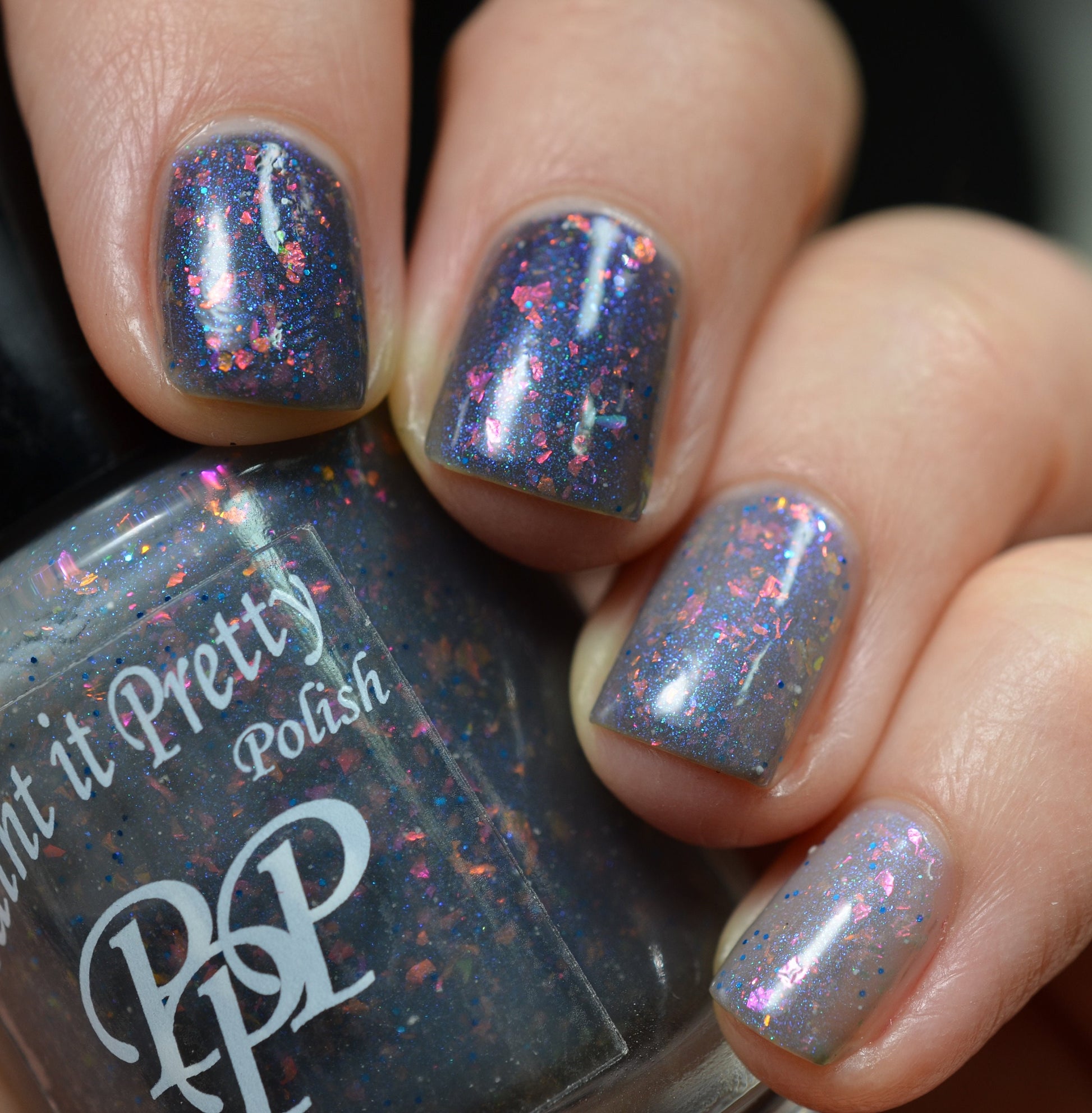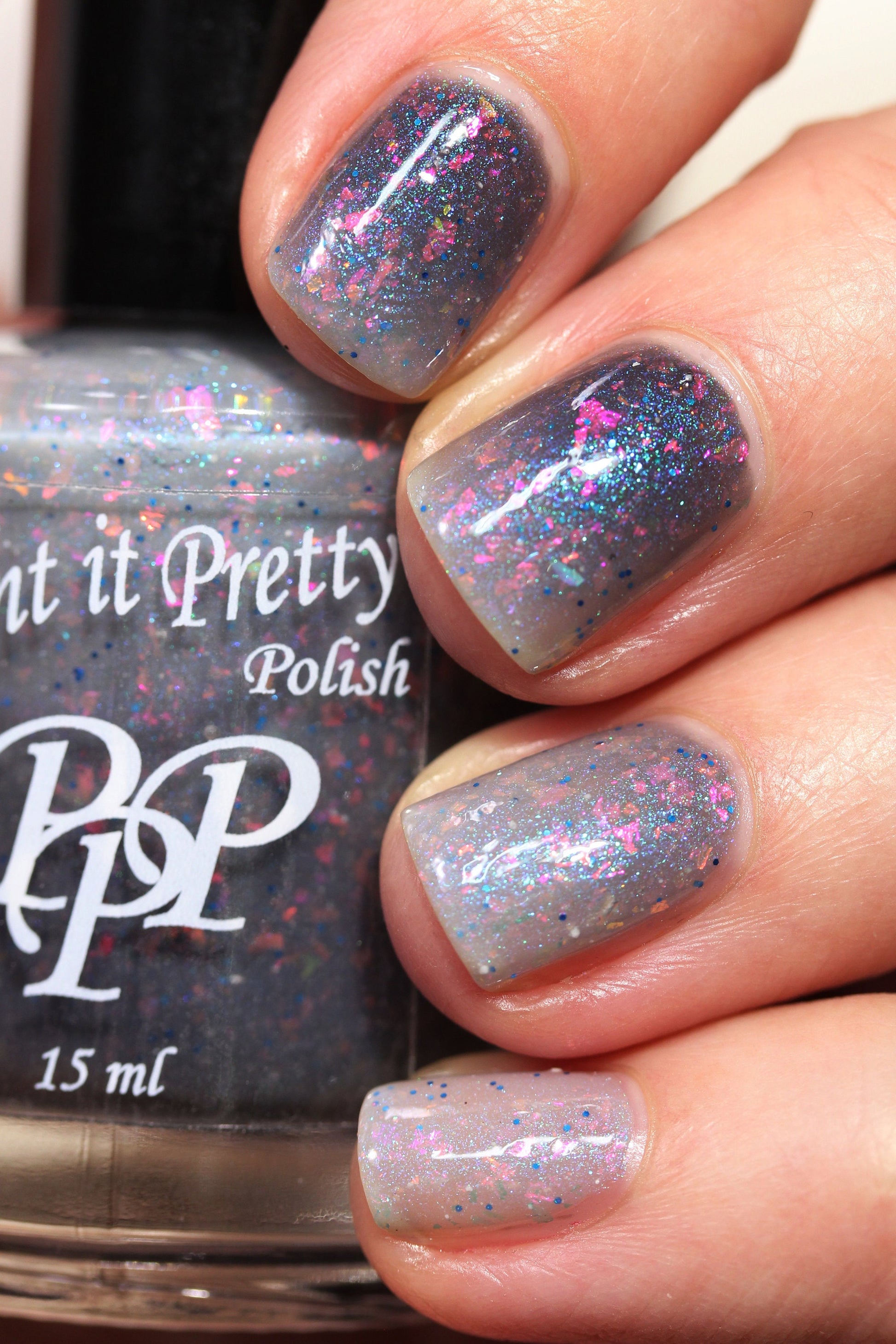 Snow Angel is a grey lovers dream thermal nail polish. Shifting between a light, almost white when warm to a darker grey almost black when cold with orange, pink, purple, green flakes, a blue shimmer and blue micro glitters.