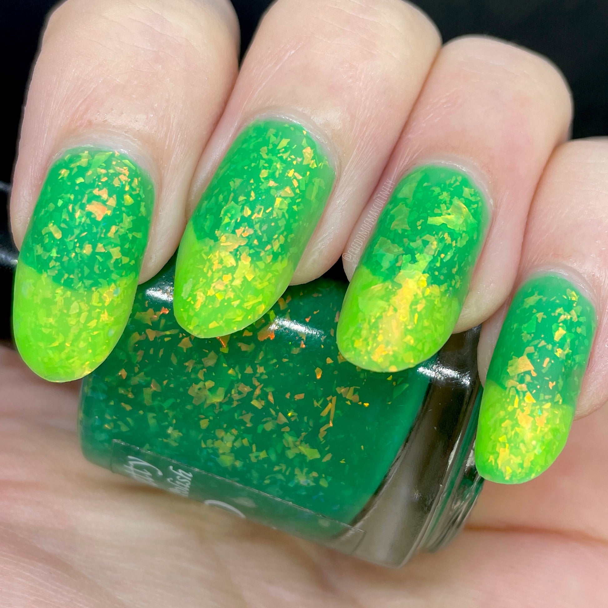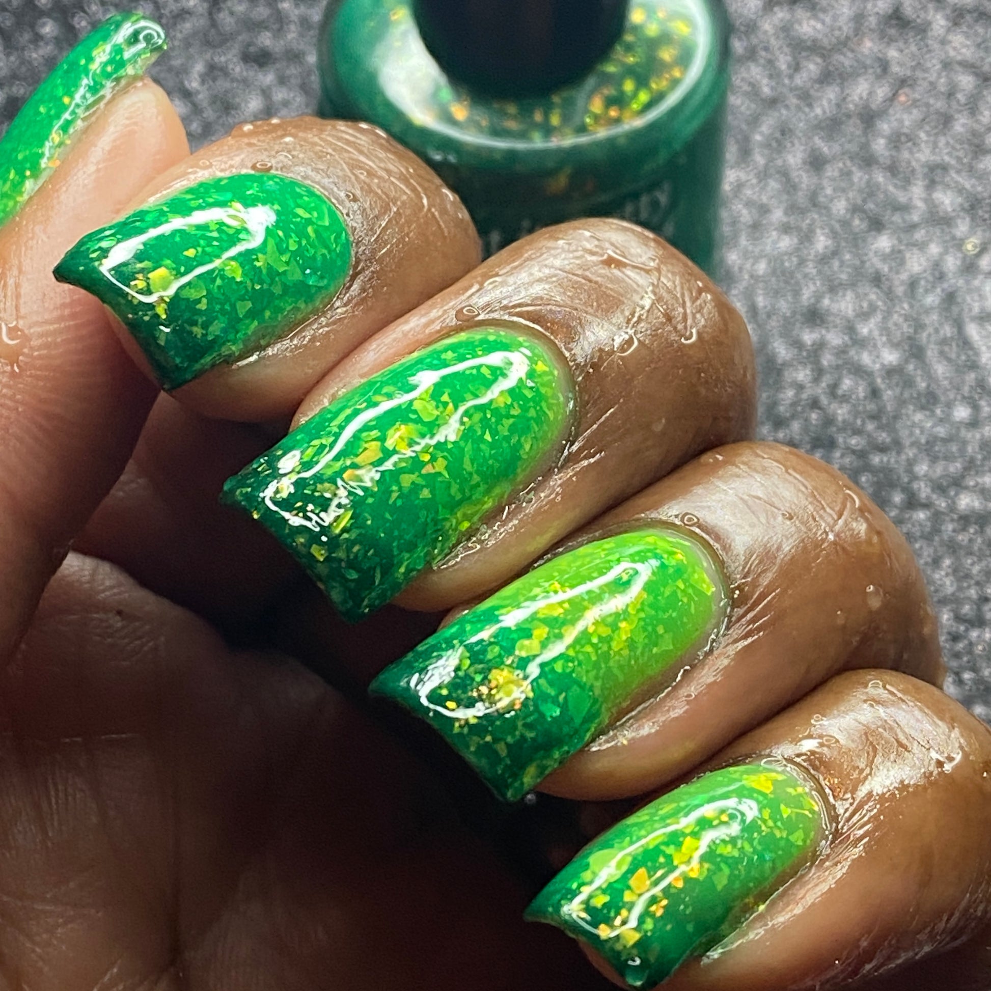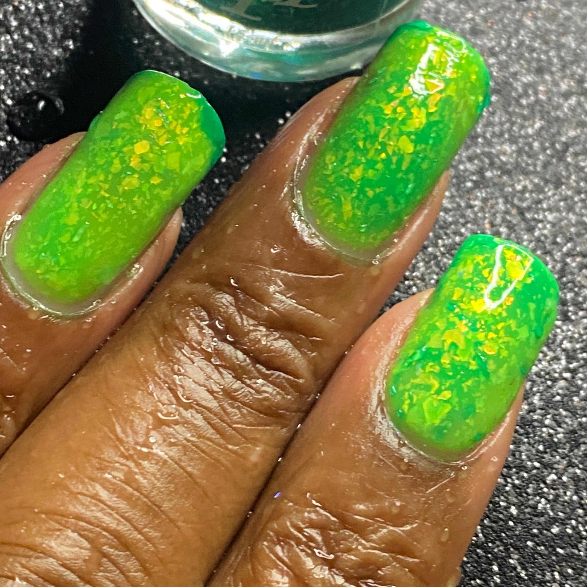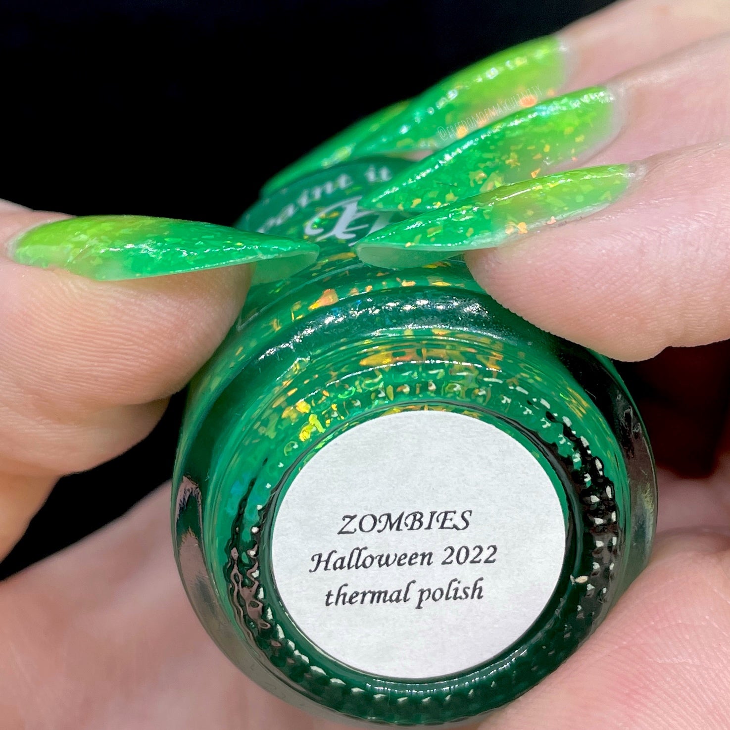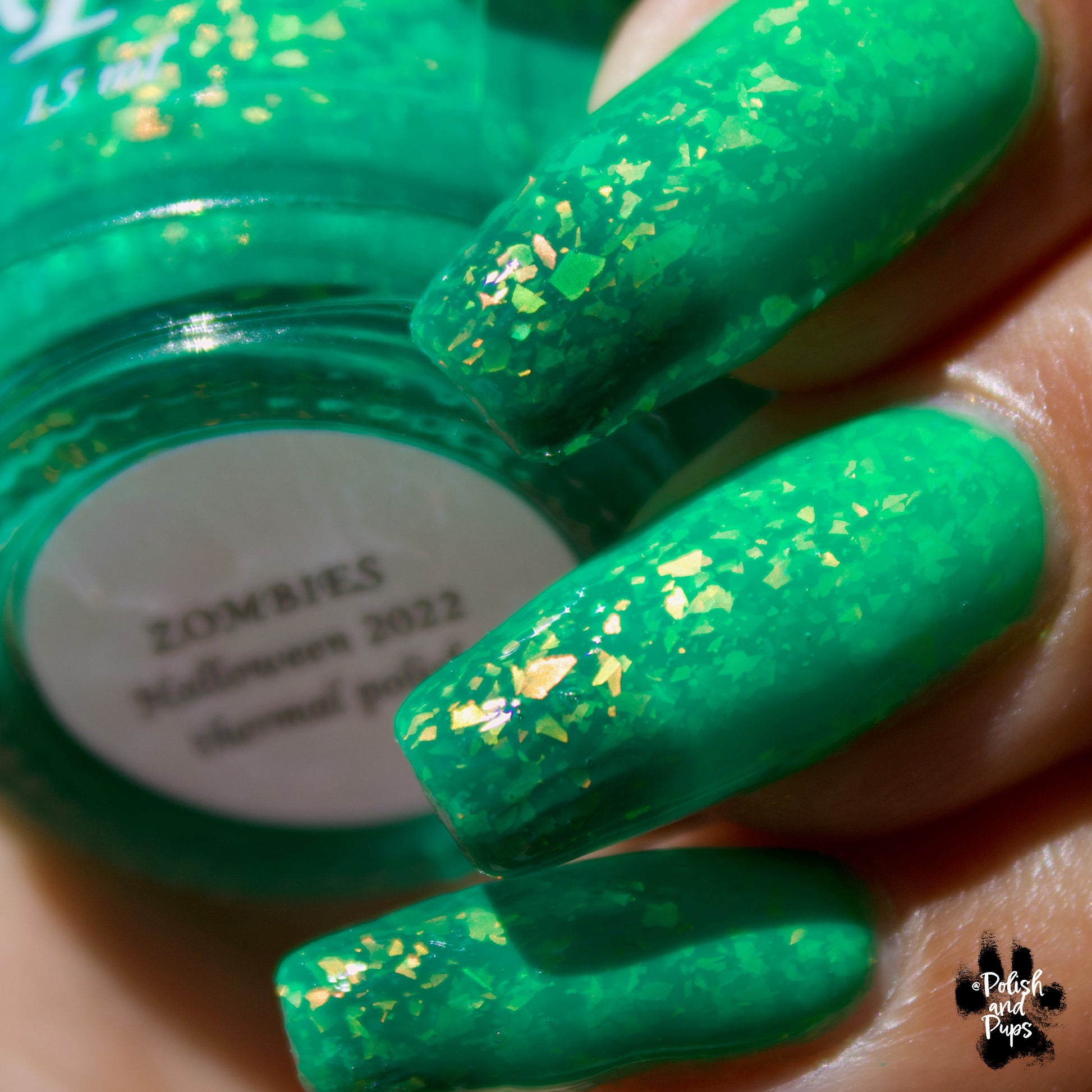 Zombies - You can’t be quite sure how it happened, but suddenly you find yourself consumed by an overwhelming desire for one thing only - POOOOOLISH! Then you see it - the perfect Halloween tri-thermal that shifts from forest green, to emerald, to finally lime green. The chameleon flakes shifting from green to gold catch your eye, and all other polishes are safe. For now.