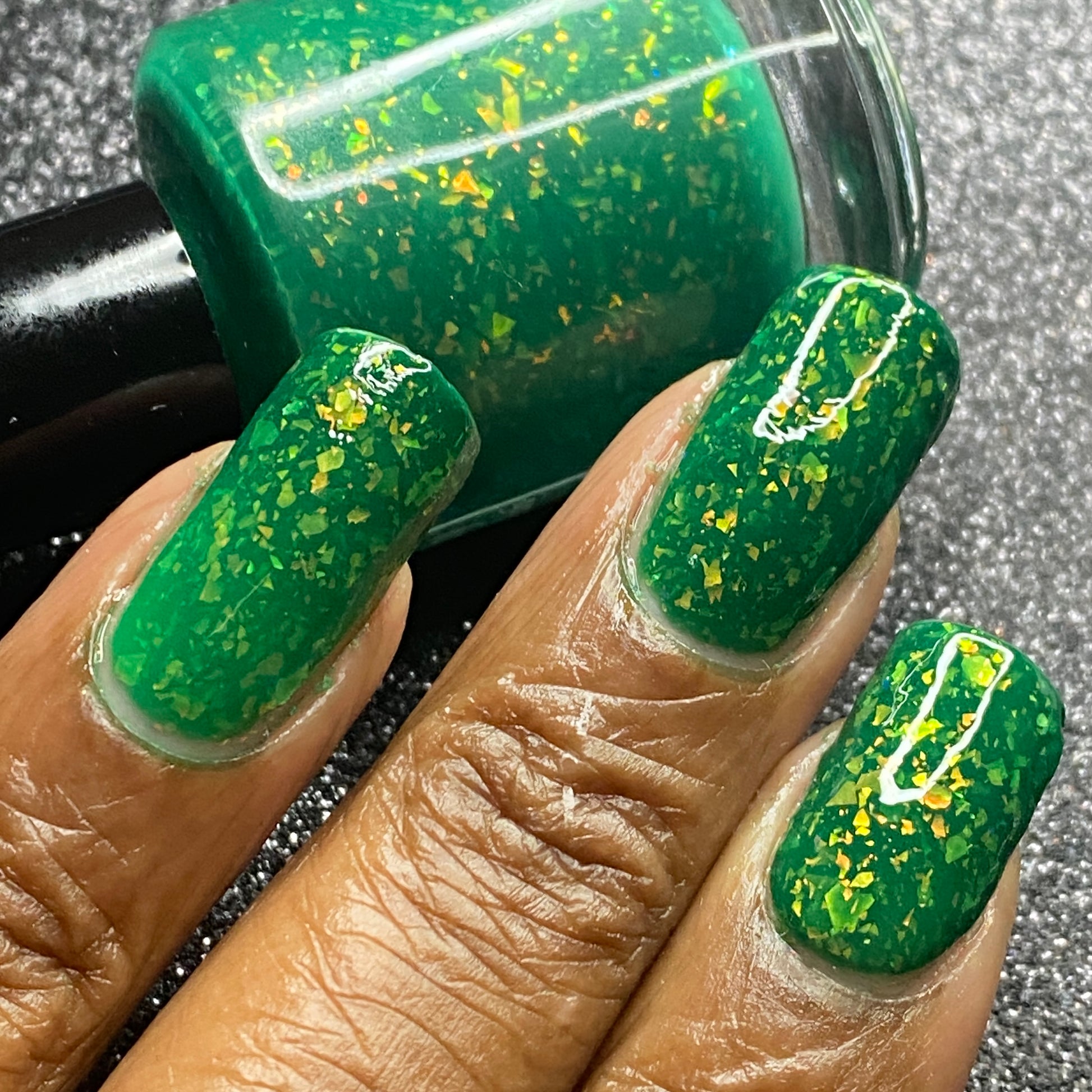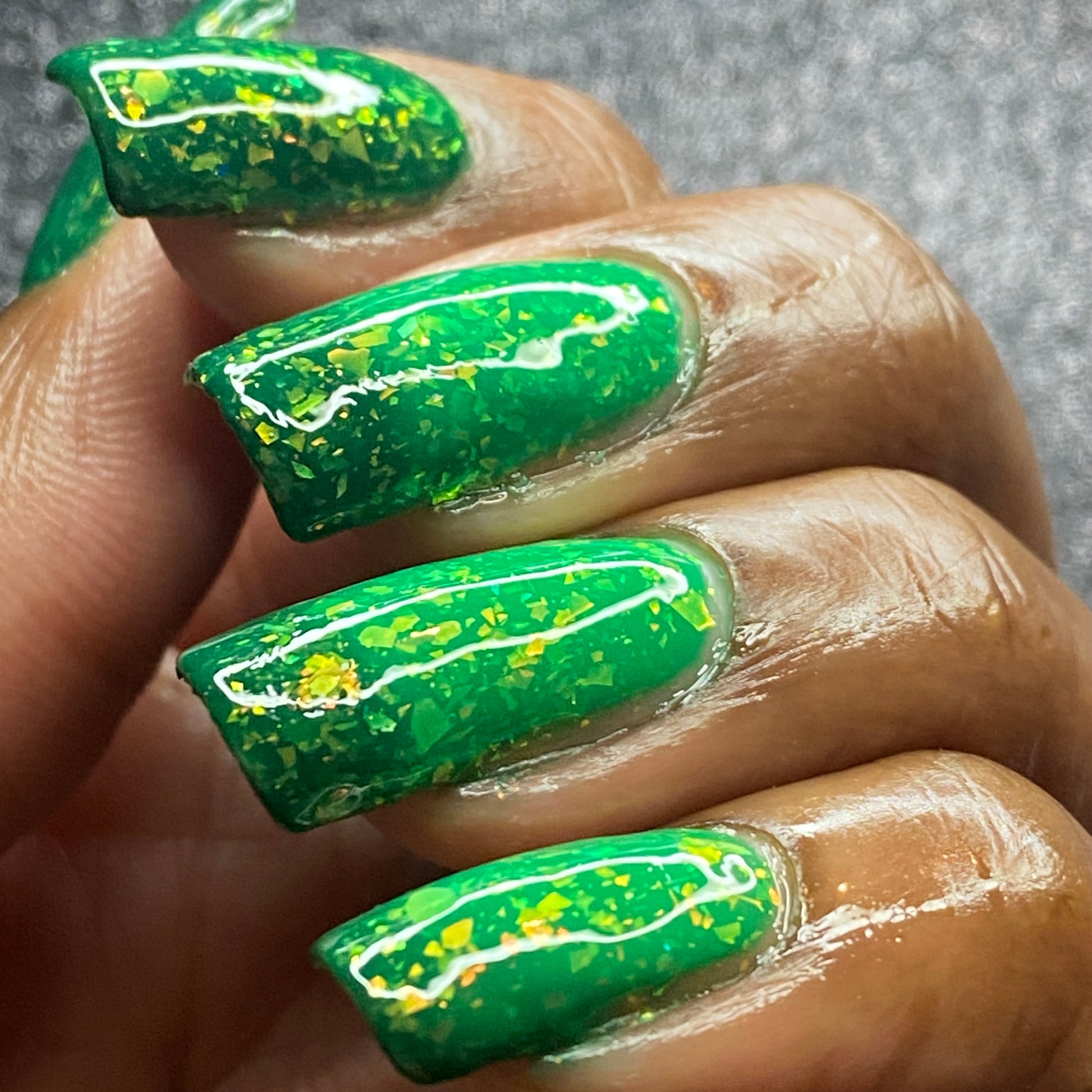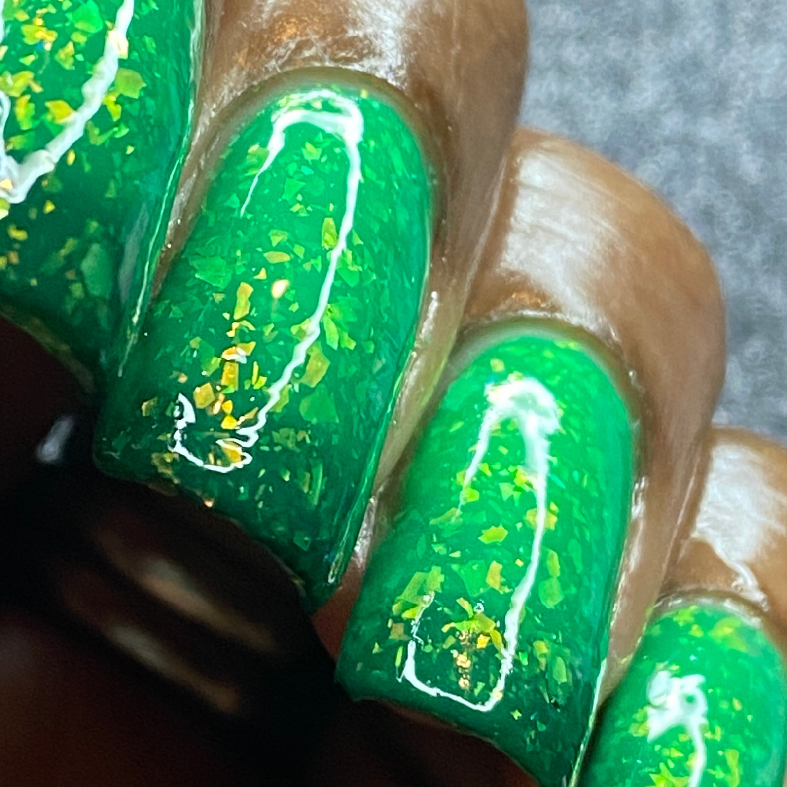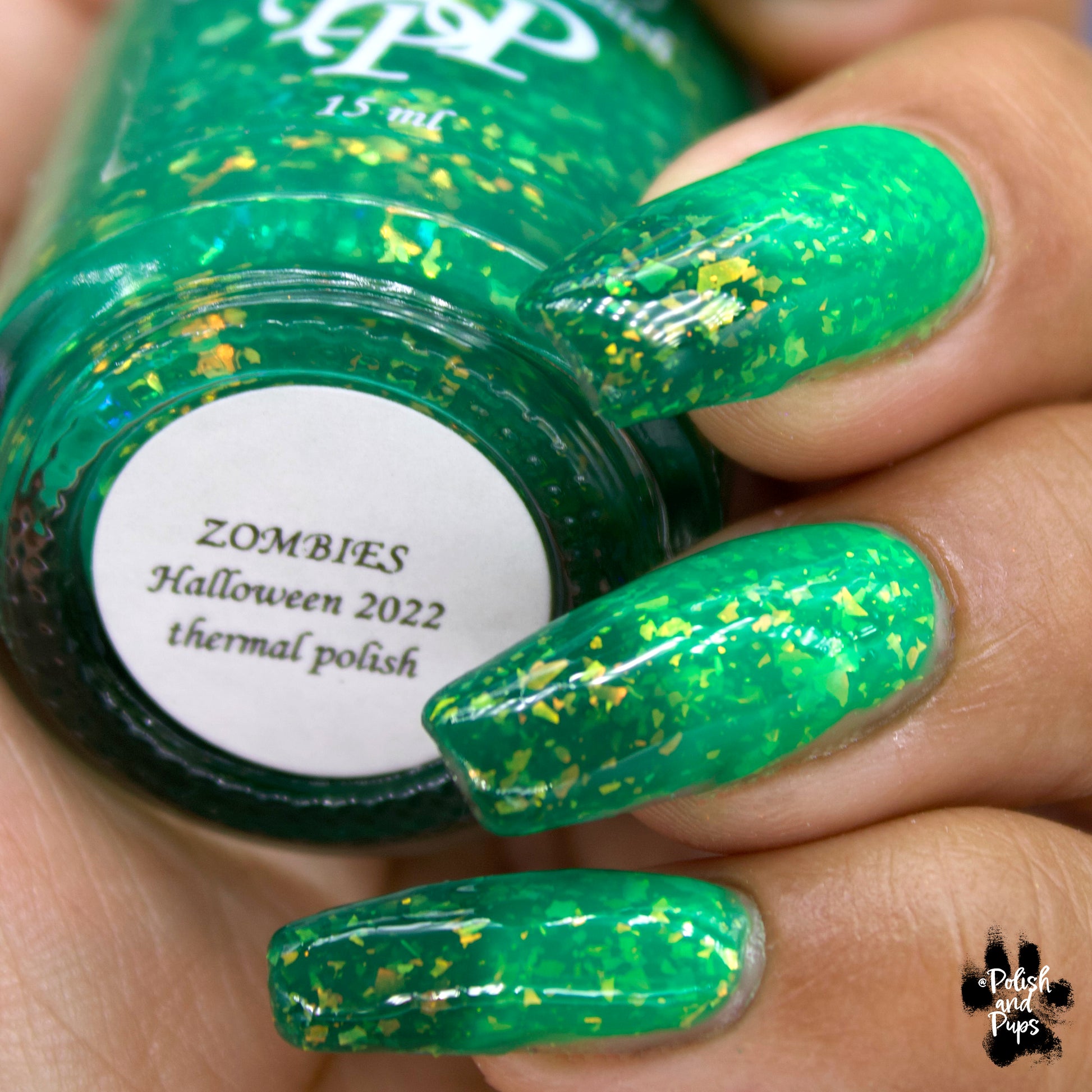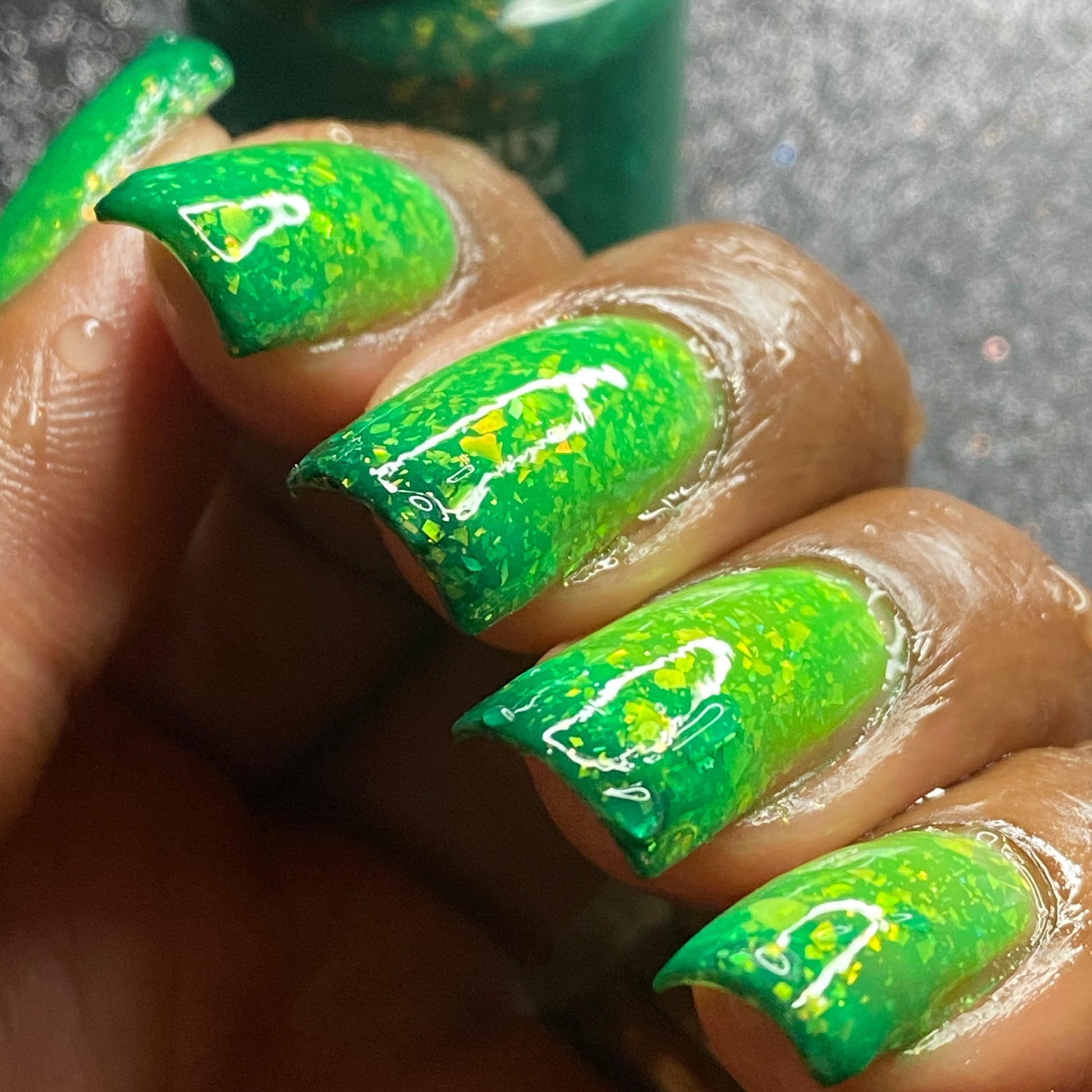 Zombies - You can’t be quite sure how it happened, but suddenly you find yourself consumed by an overwhelming desire for one thing only - POOOOOLISH! Then you see it - the perfect Halloween tri-thermal that shifts from forest green, to emerald, to finally lime green. The chameleon flakes shifting from green to gold catch your eye, and all other polishes are safe. For now.