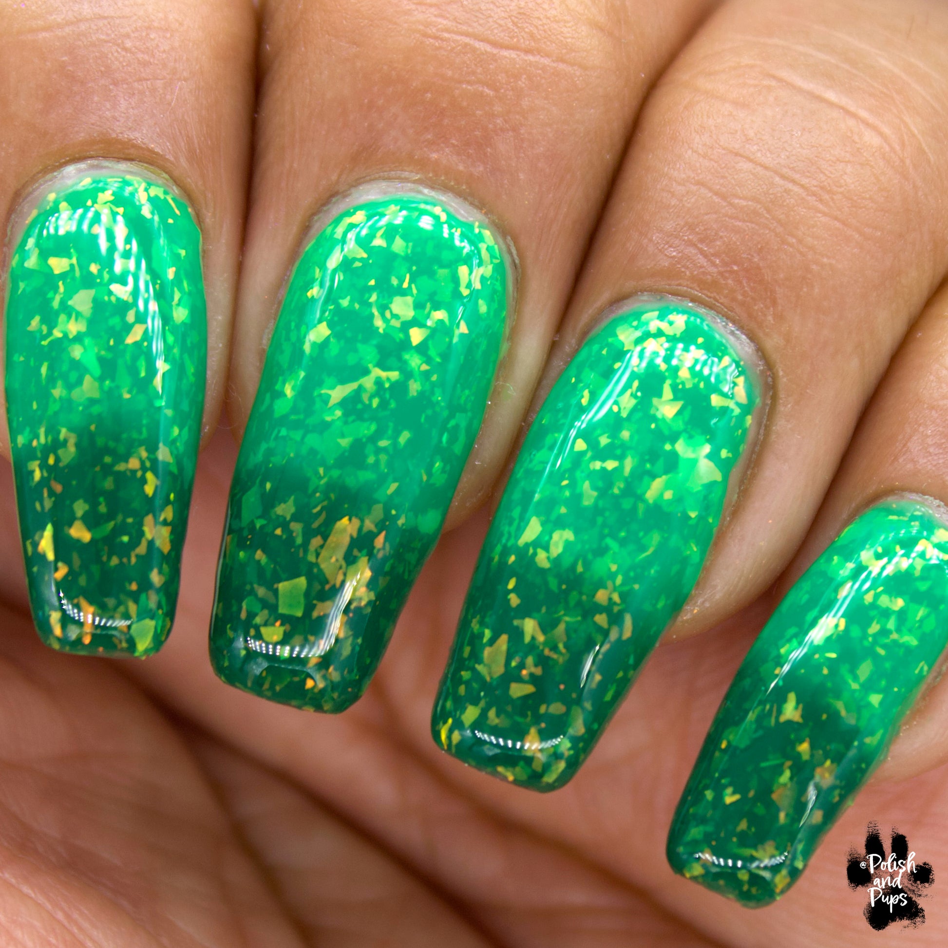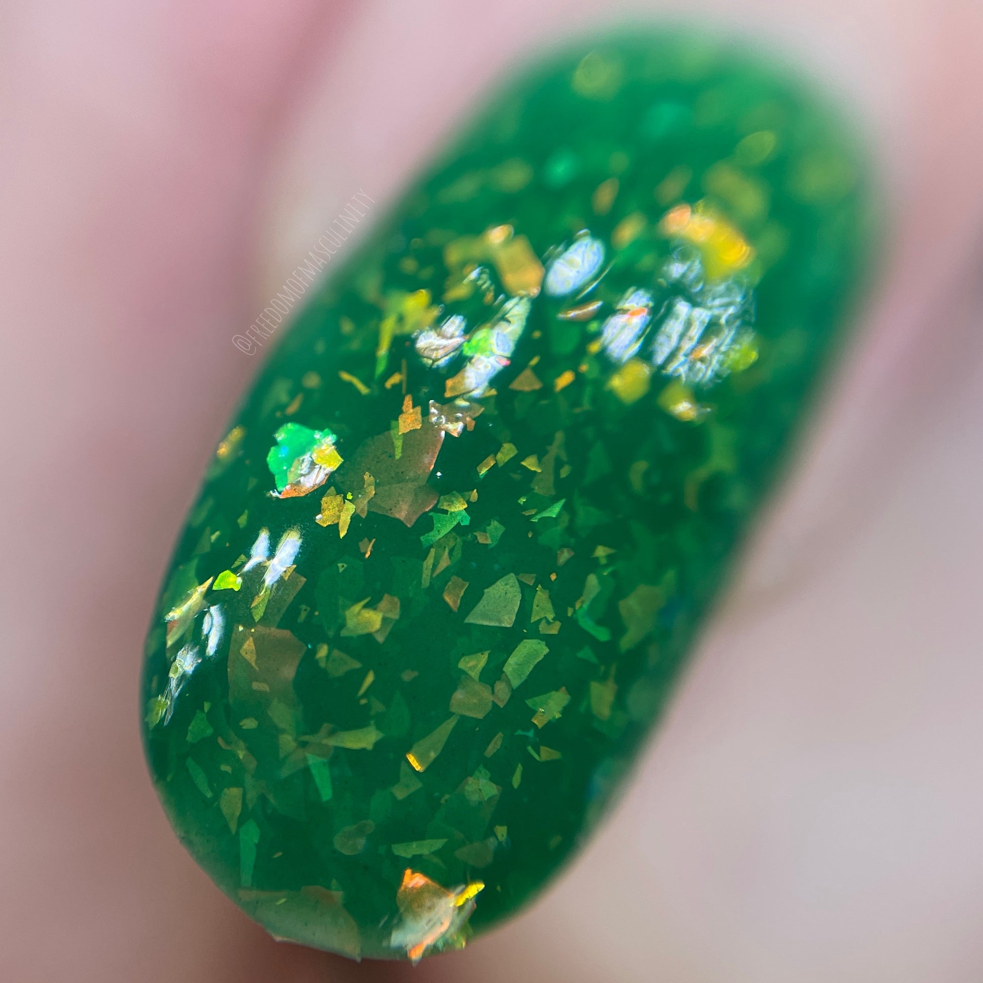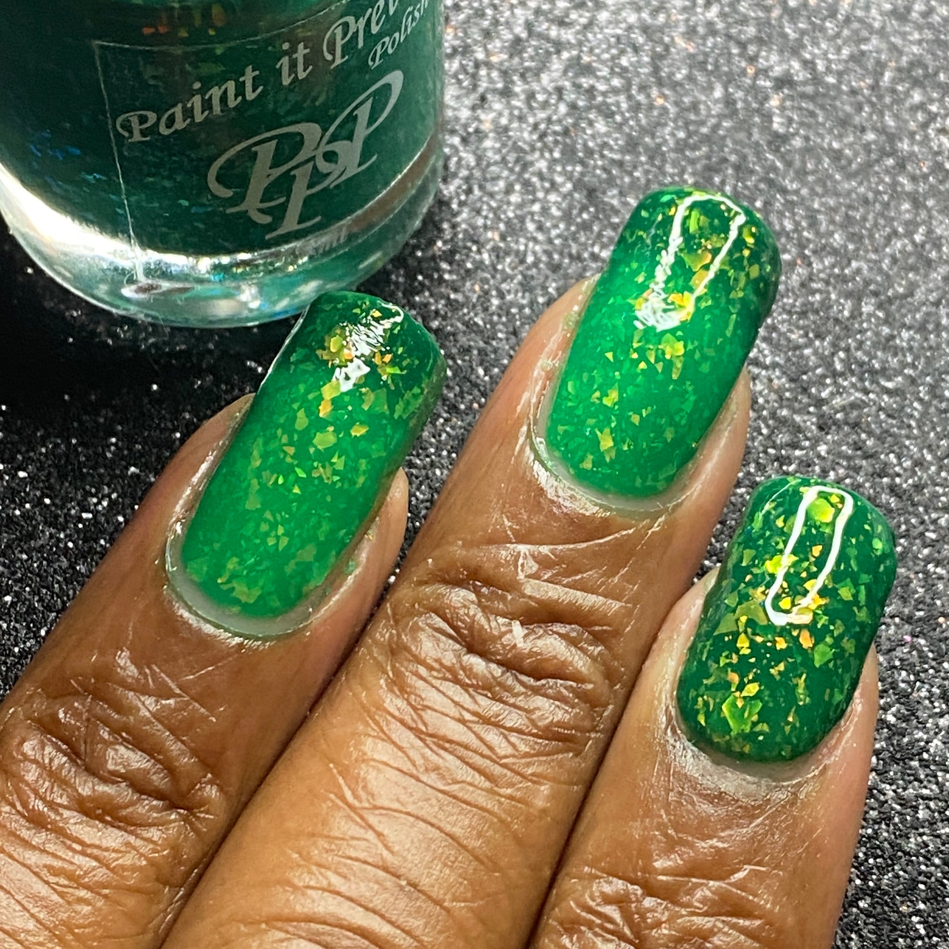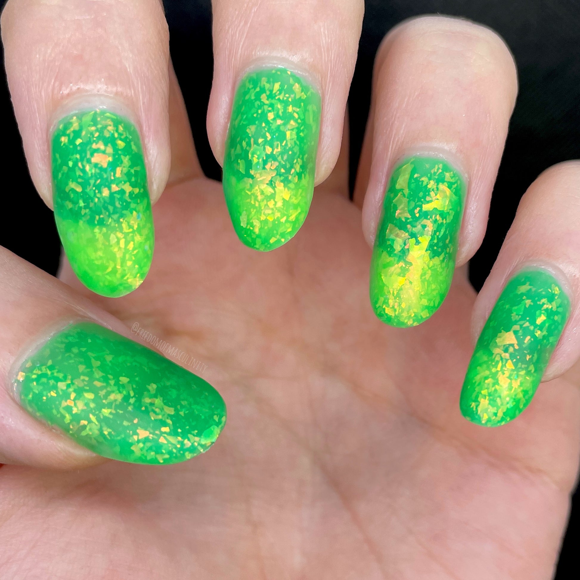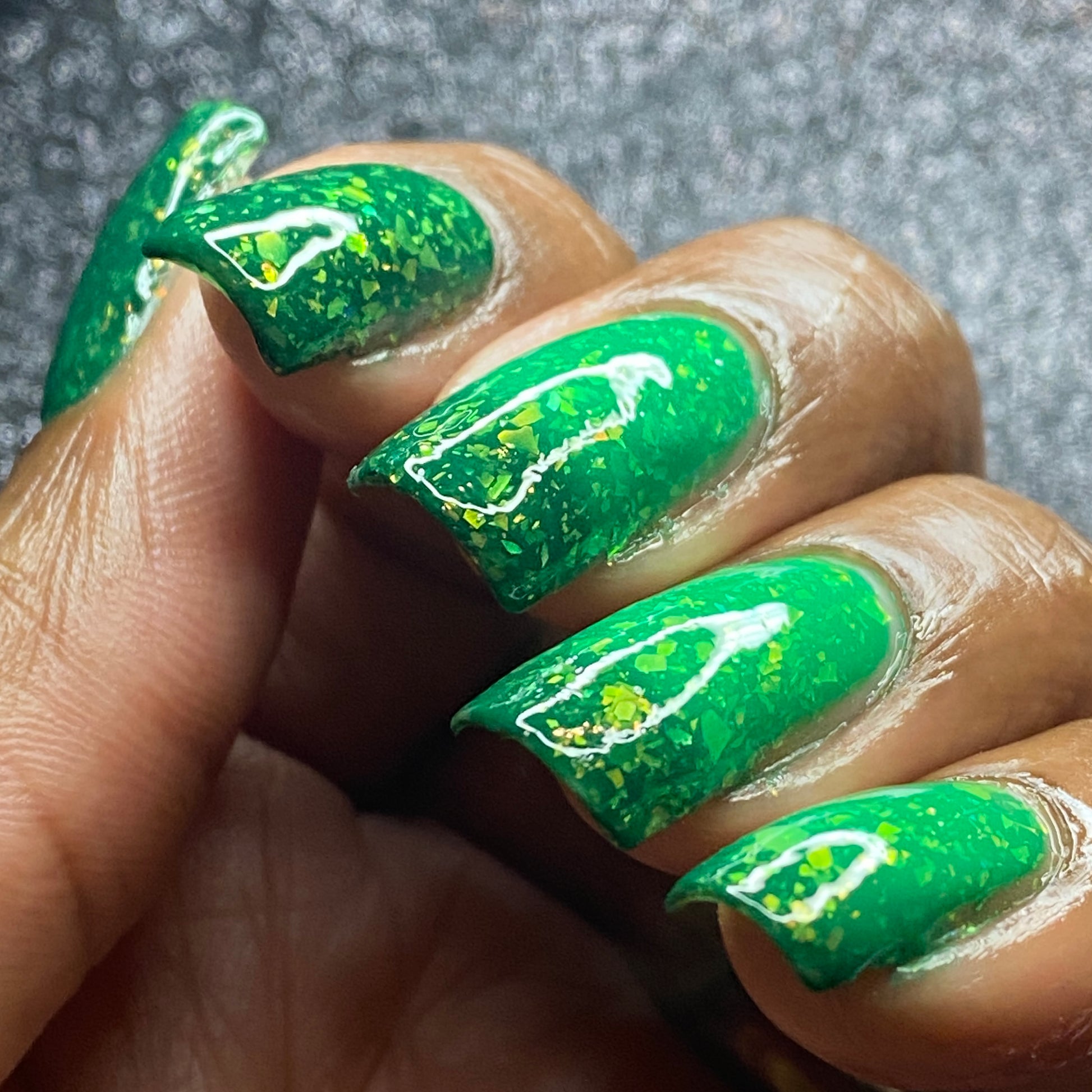 Zombies - You can’t be quite sure how it happened, but suddenly you find yourself consumed by an overwhelming desire for one thing only - POOOOOLISH! Then you see it - the perfect Halloween tri-thermal that shifts from forest green, to emerald, to finally lime green. The chameleon flakes shifting from green to gold catch your eye, and all other polishes are safe. For now.
