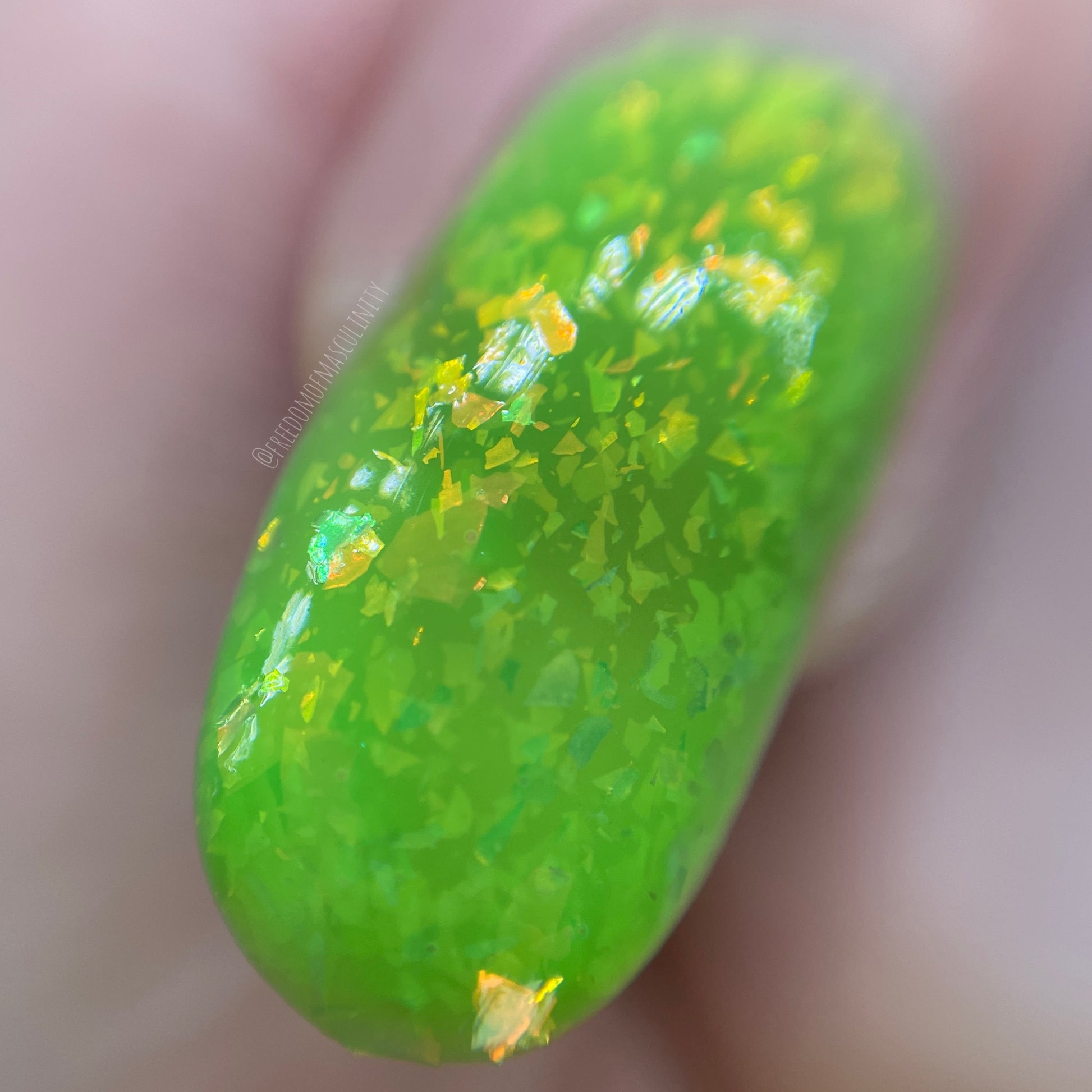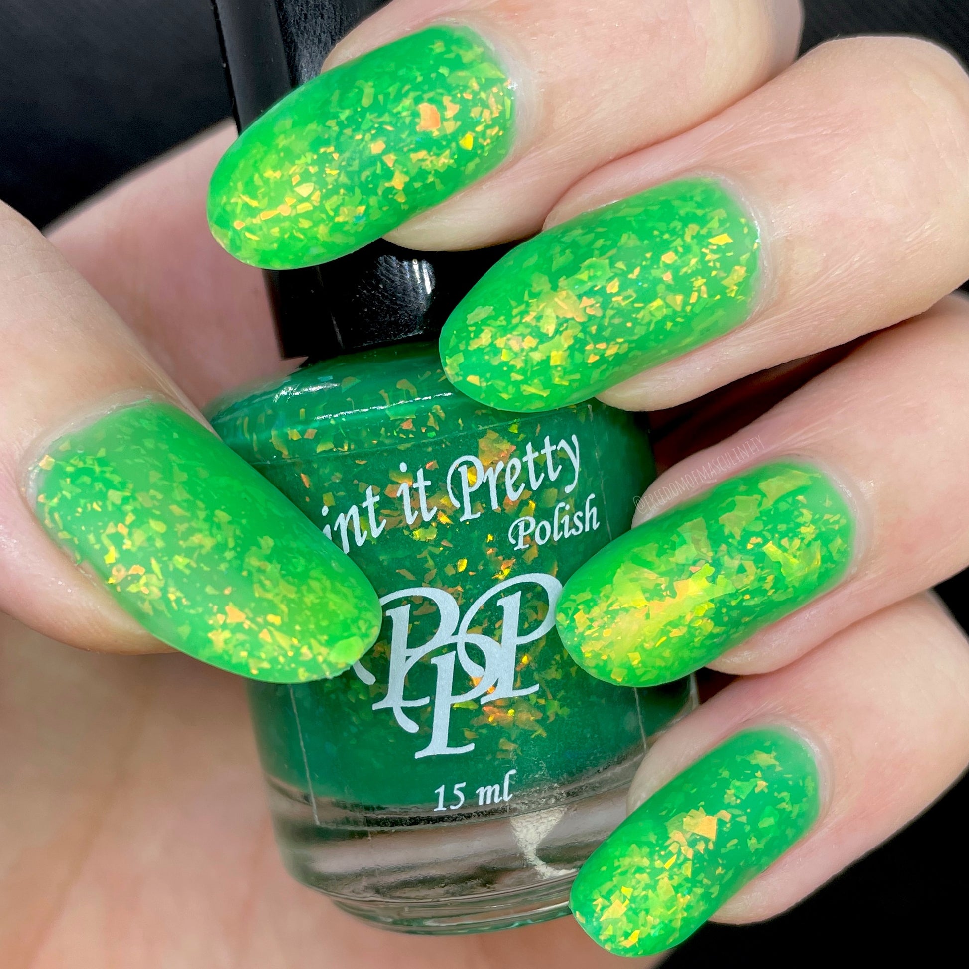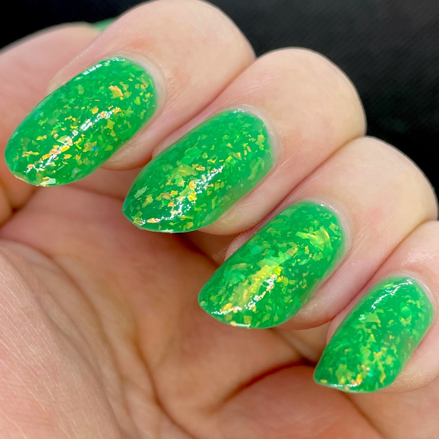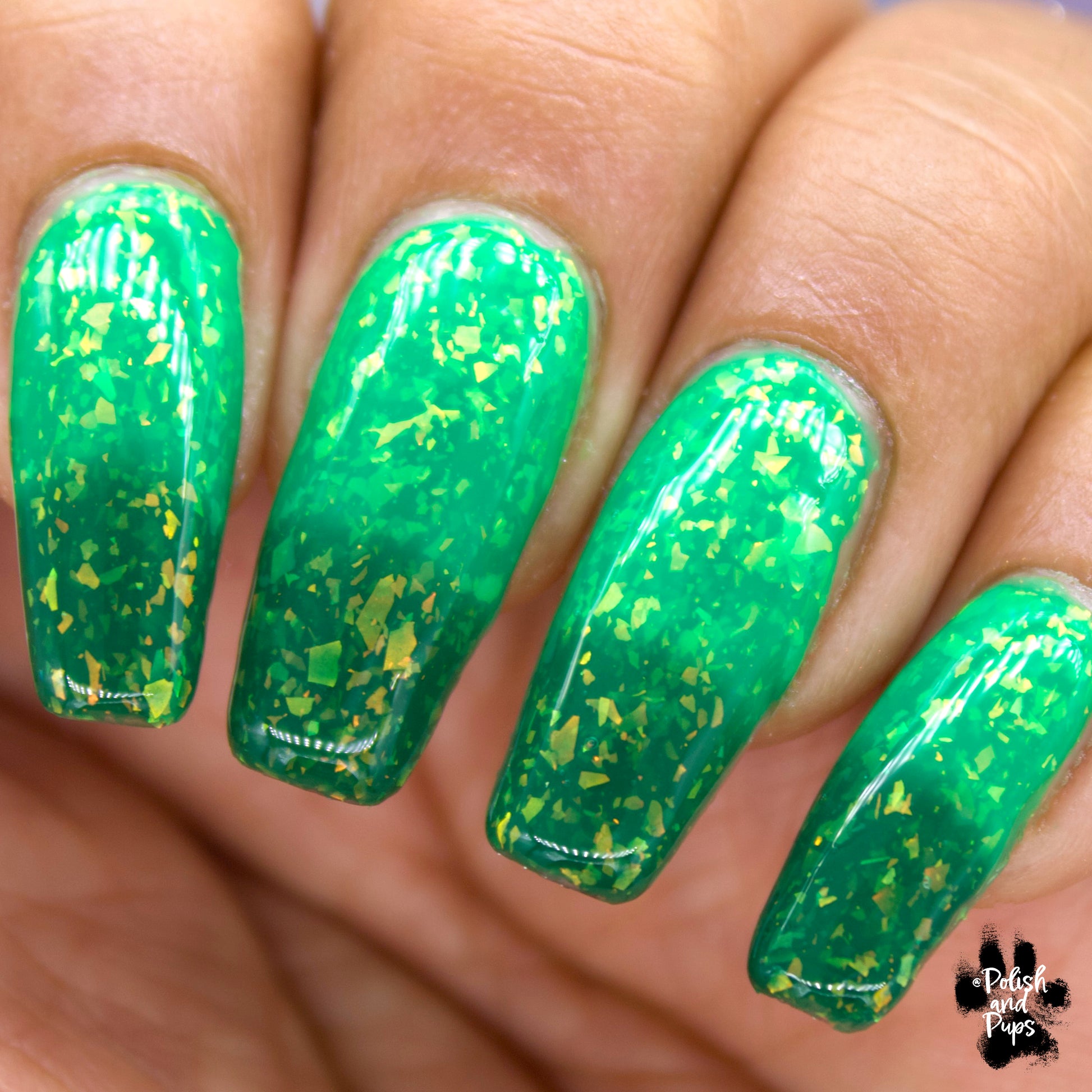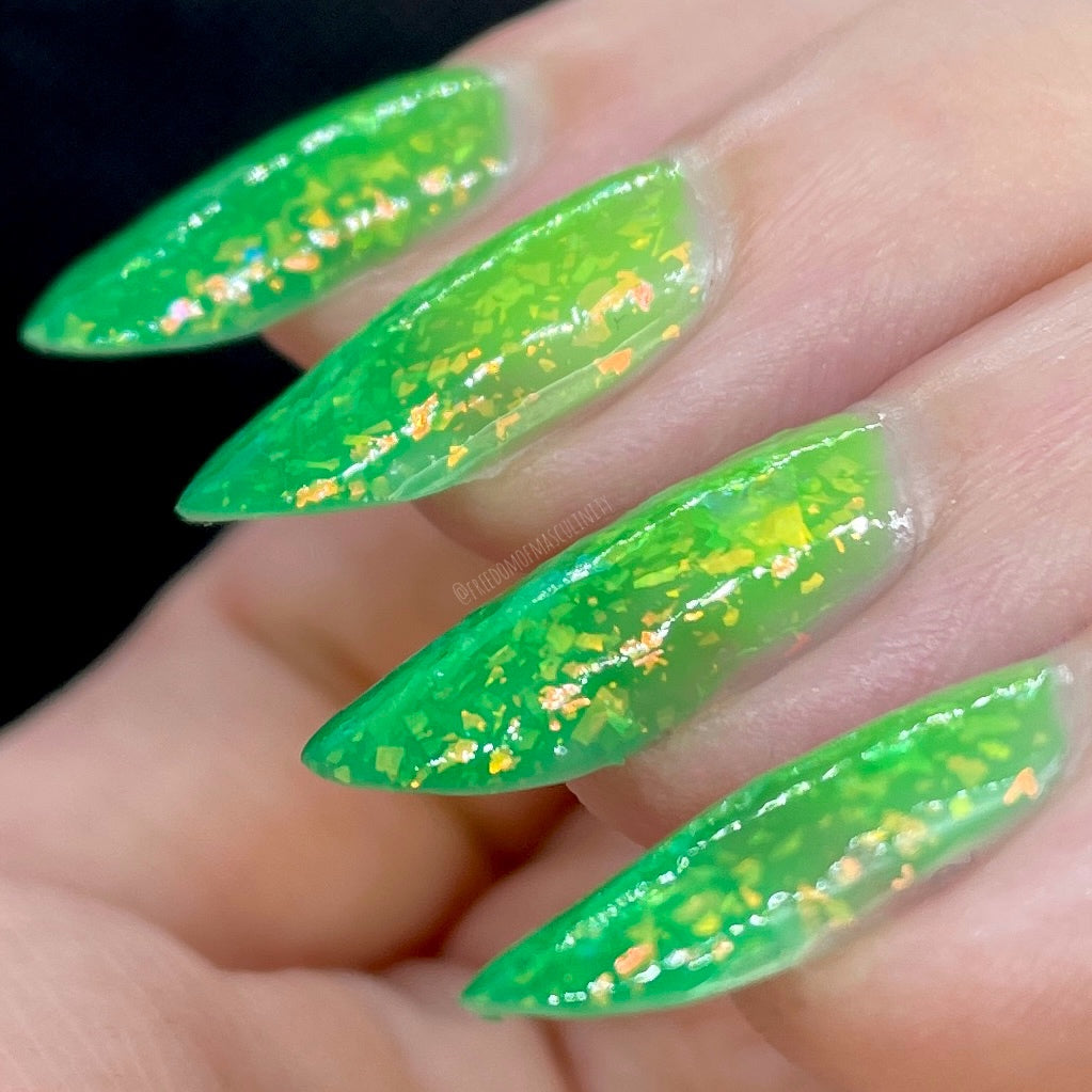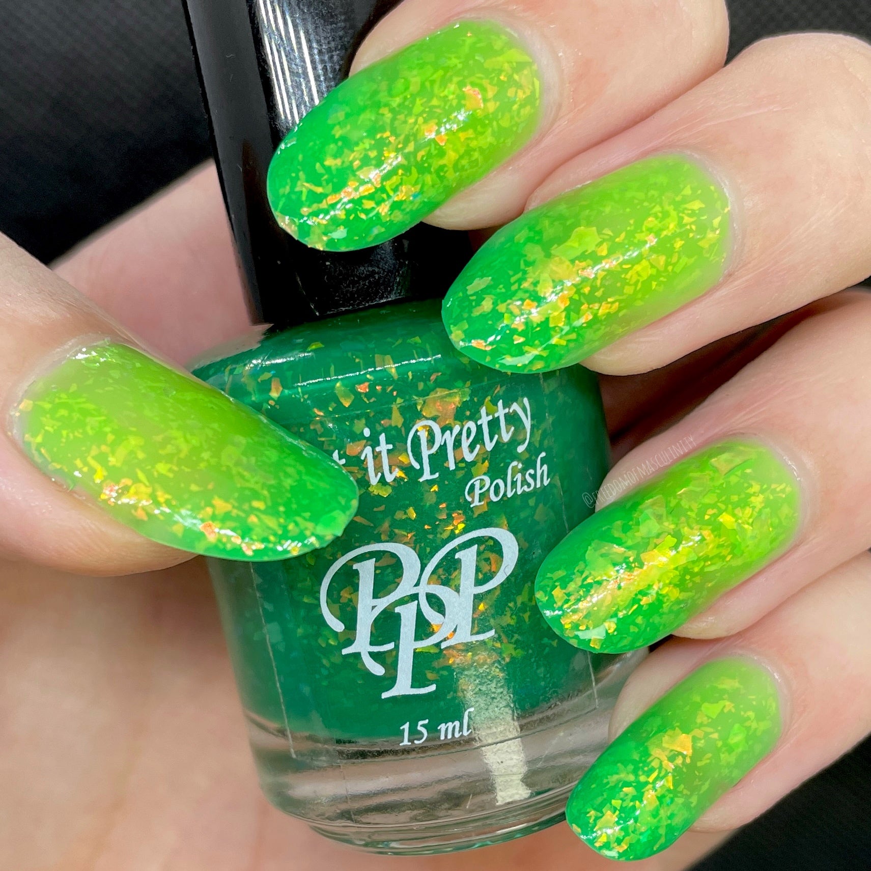 Zombies - You can’t be quite sure how it happened, but suddenly you find yourself consumed by an overwhelming desire for one thing only - POOOOOLISH! Then you see it - the perfect Halloween tri-thermal that shifts from forest green, to emerald, to finally lime green. The chameleon flakes shifting from green to gold catch your eye, and all other polishes are safe. For now.