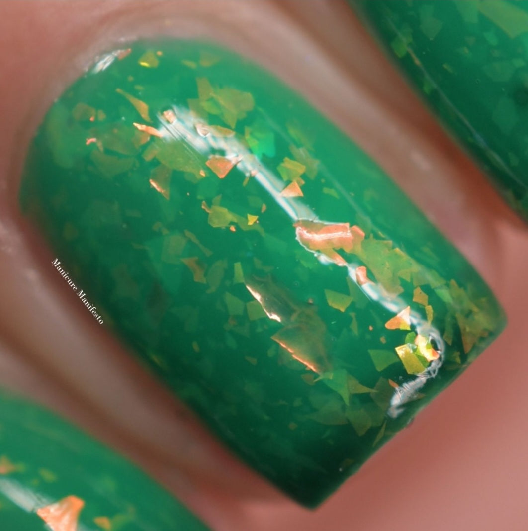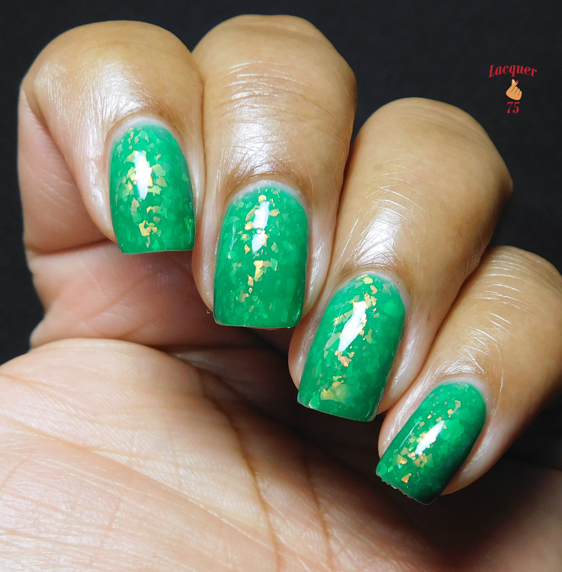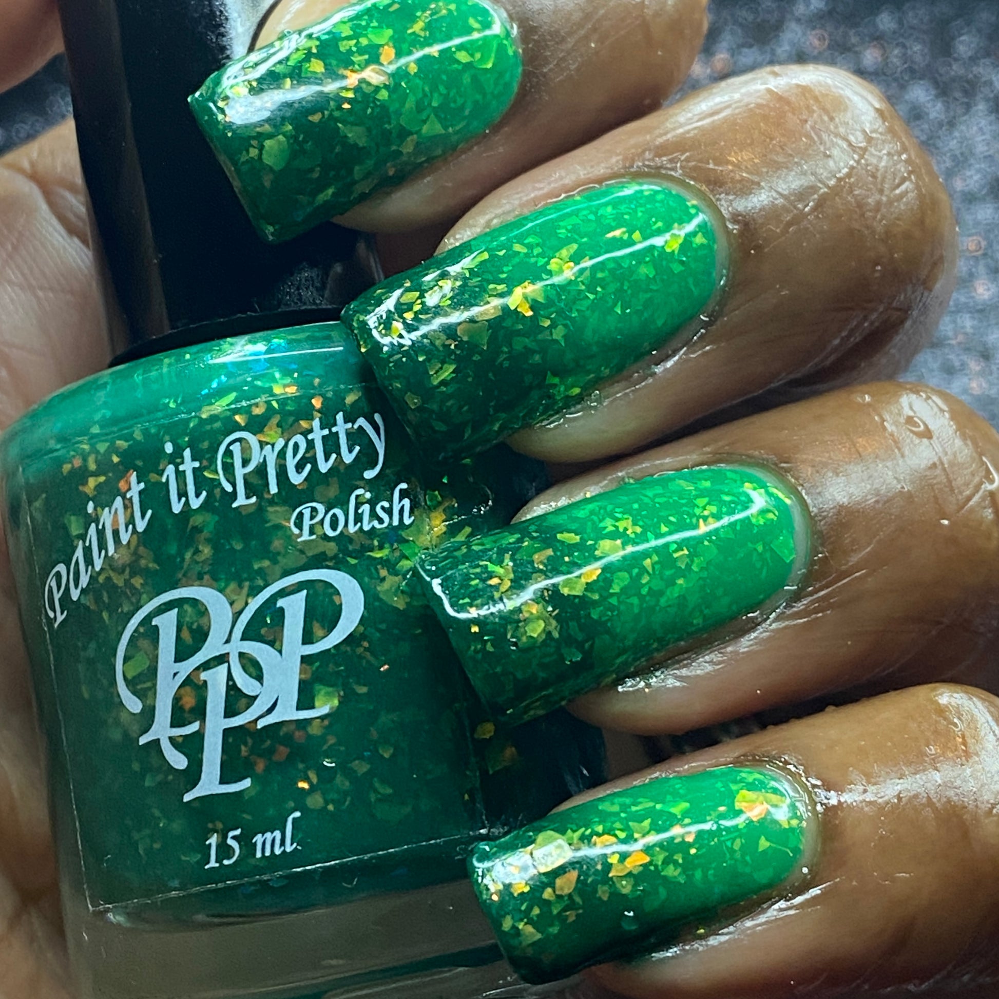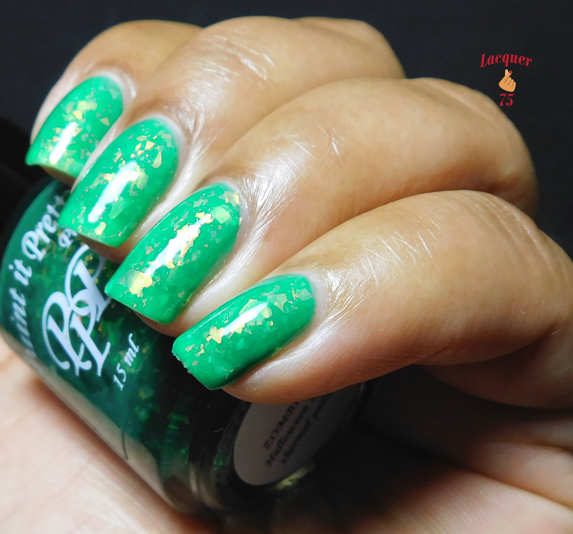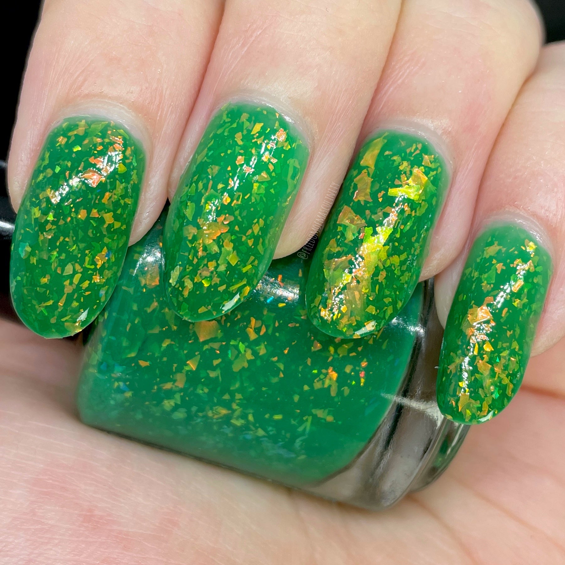 Zombies - You can’t be quite sure how it happened, but suddenly you find yourself consumed by an overwhelming desire for one thing only - POOOOOLISH! Then you see it - the perfect Halloween tri-thermal that shifts from forest green, to emerald, to finally lime green. The chameleon flakes shifting from green to gold catch your eye, and all other polishes are safe. For now.